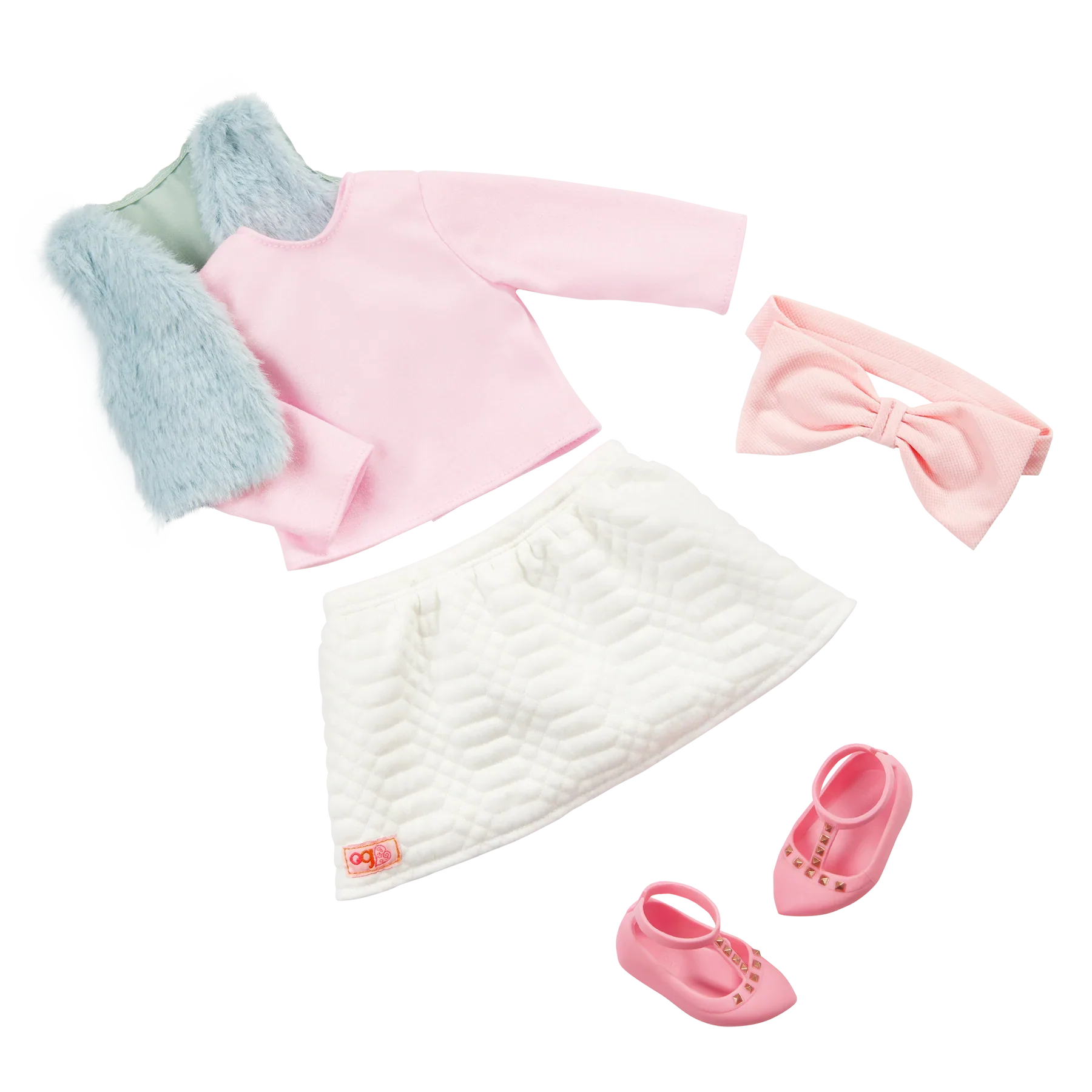 - A készlet tartalma: baba, fejpánt, felső, mellény, szoknya, bugyi, cipő.