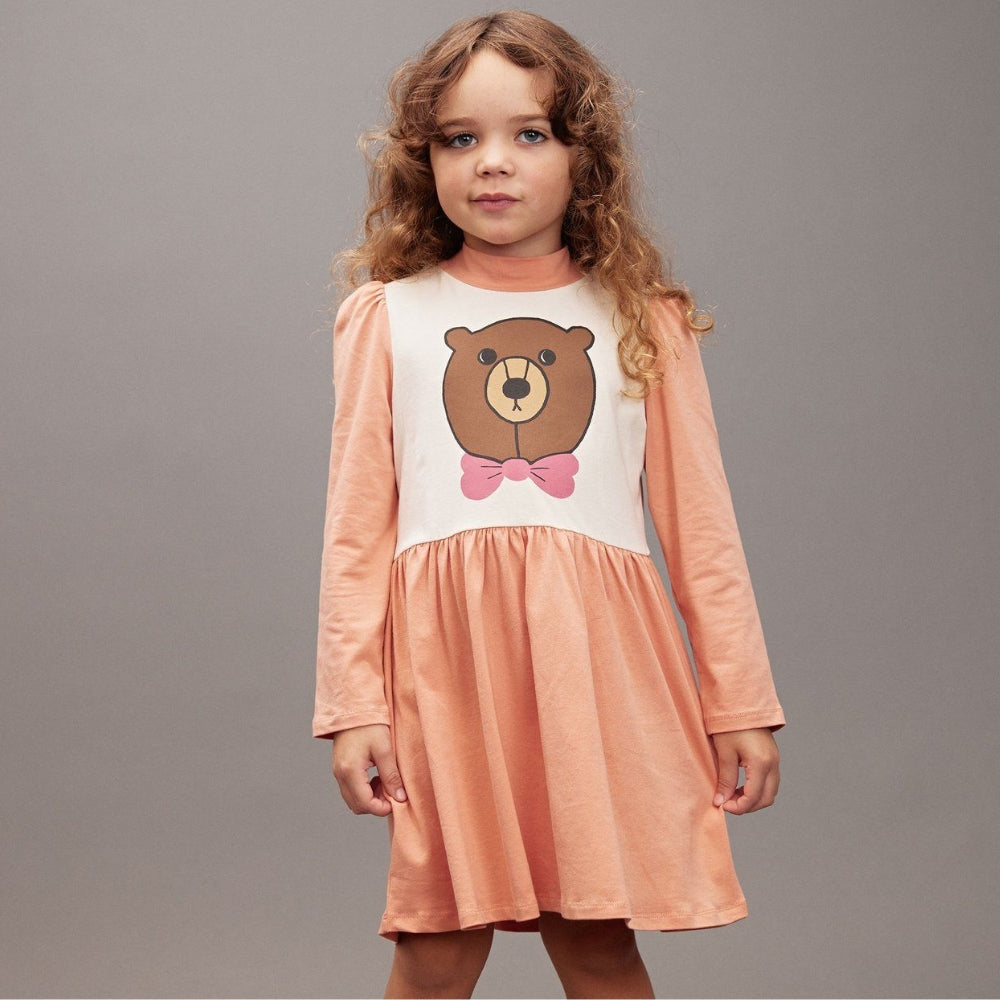 Az elején egy rózsaszín csokornyakkendős macit ábrázoló nagyméretű nyomat díszíti, ami növeli az általános bájt, és a ruhát a ruhatár kedvenc darabjává teszi.