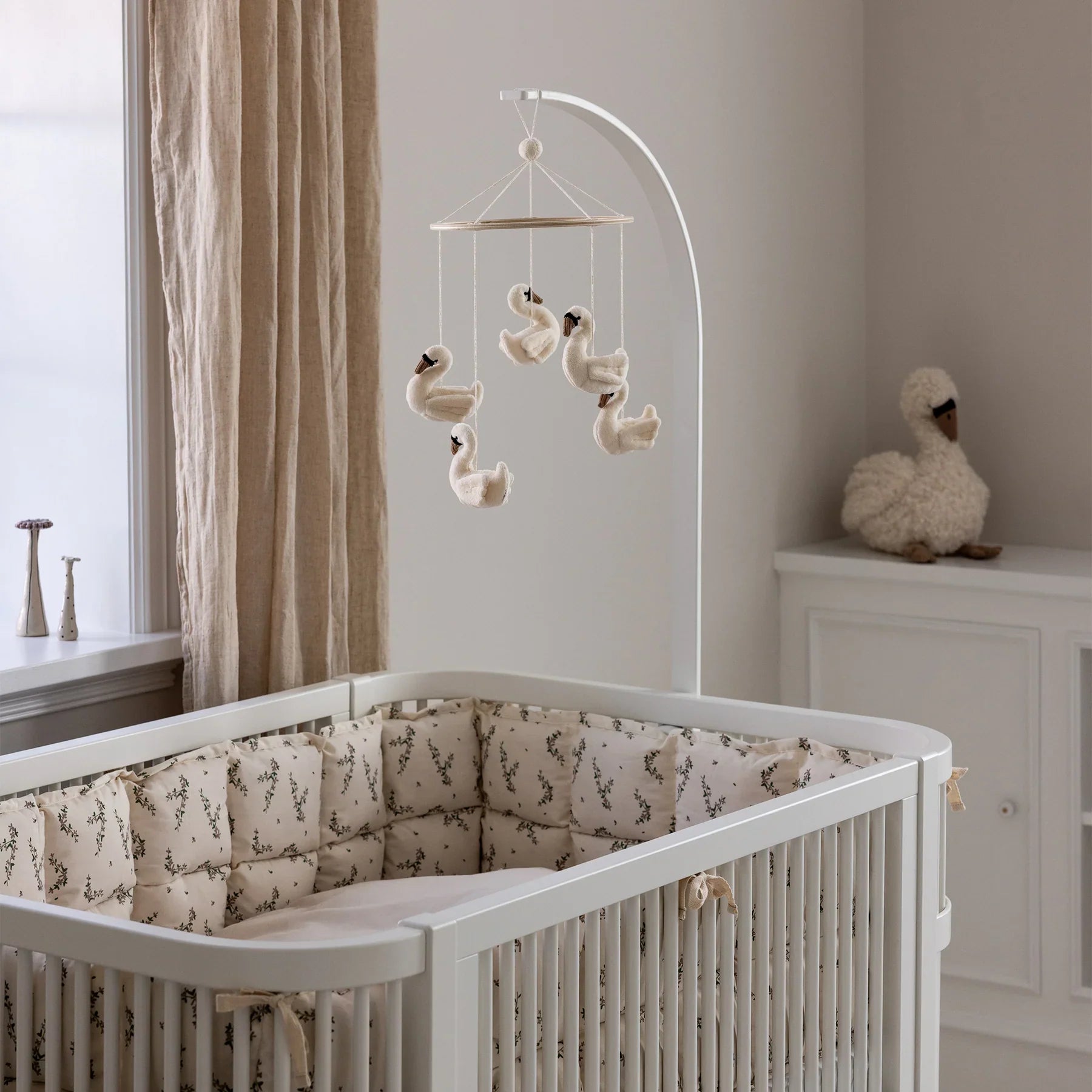 A Sebra gyermekágyi körhinta öt puha hattyúval, amelyek egy finom fa karikán lebegnek, gyönyörű módja annak, hogy nyugodt, megnyugtató hangulatot teremtsen a kiságy vagy pelenkázóasztal felett.