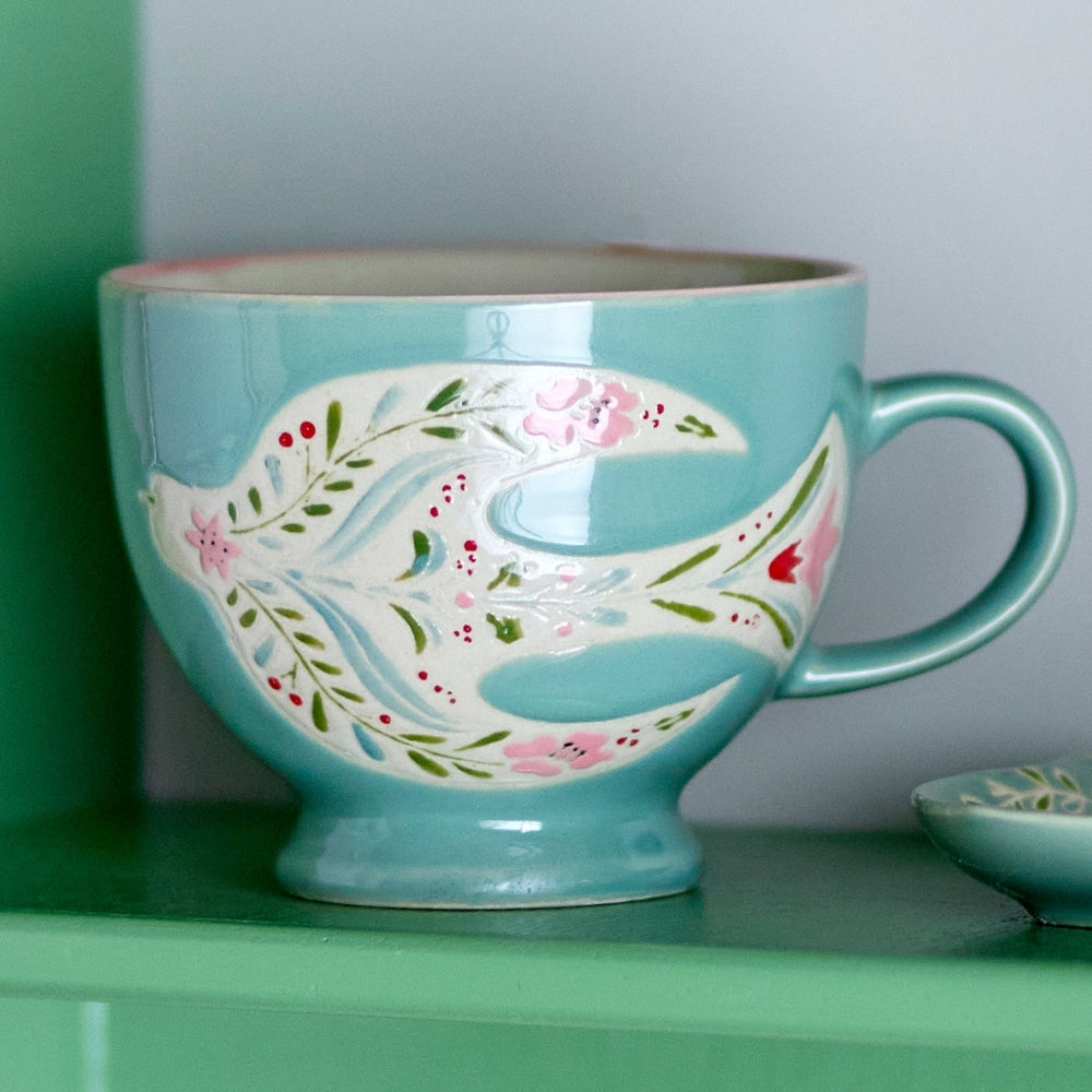 A finoman szélesített alap és a finoman rózsaszín perem könnyedséget és eleganciát kölcsönöz, míg a madarak, virágok és levelek kézzel festett motívumai megragadják a tekintetet.