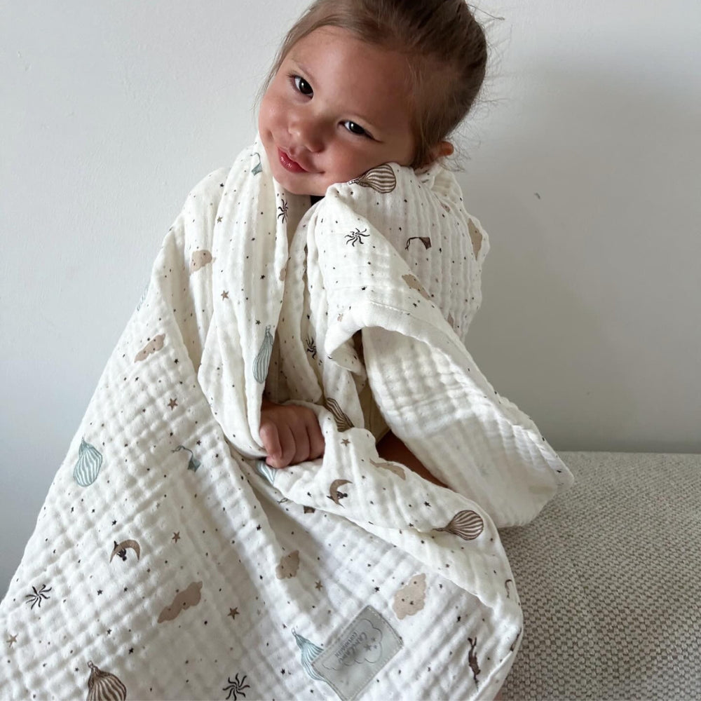 A kivételes könnyűségéről és kellemes textúrájáról ismert finom muszlin anyag teszi a takarót tökéletessé a baba öleléséhez, a babakocsiban való takaráshoz séták során, vagy a babaszoba dekoratív kiegészítőjeként.