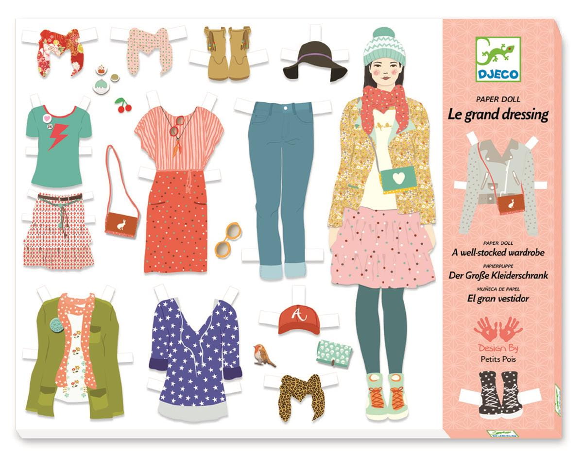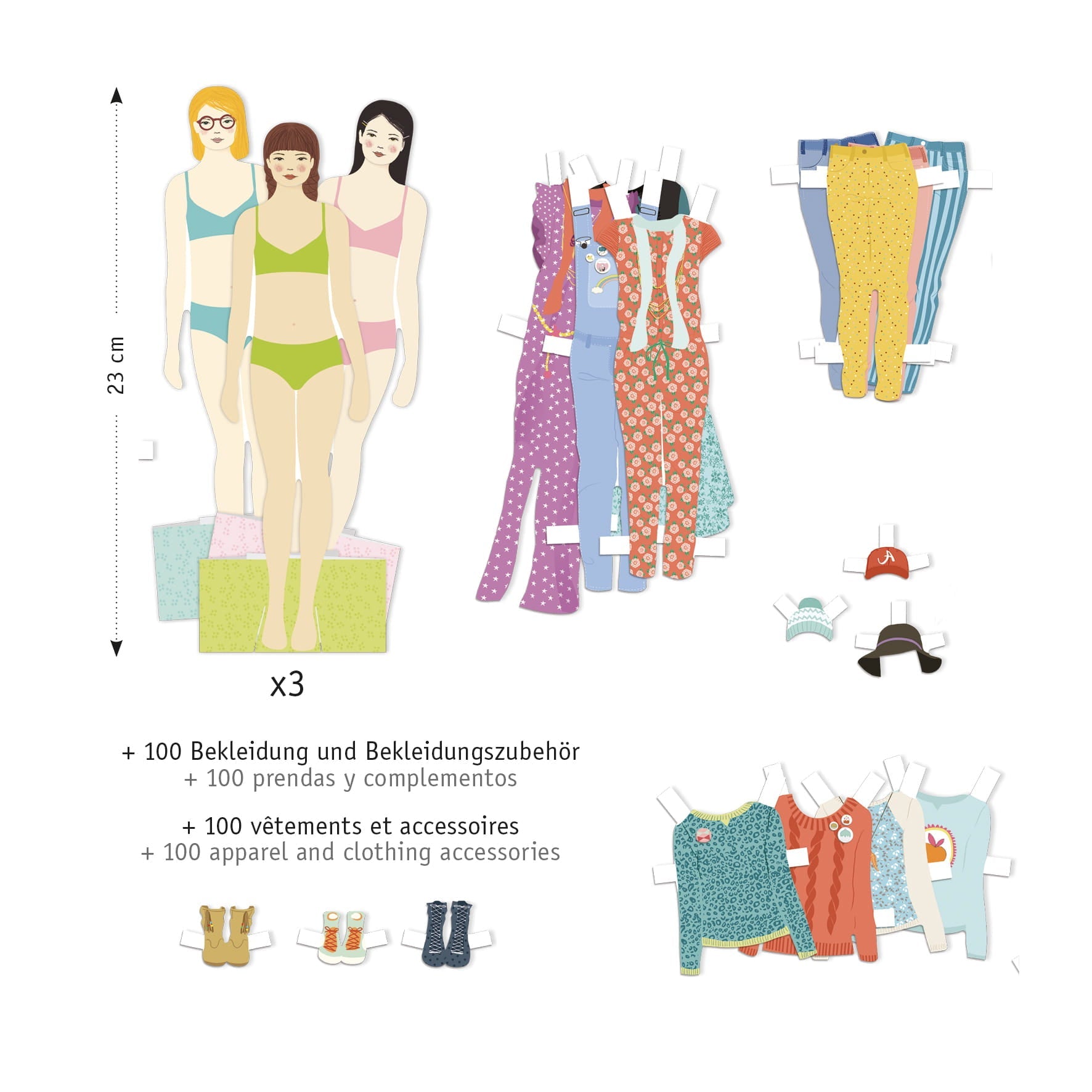 A gyermekművészeti készlet három vastag kartonból készült kislányt és egy nagy, rekeszekkel ellátott szekrényt tartalmaz, amelyben rengeteg ruhát tárolhatsz.