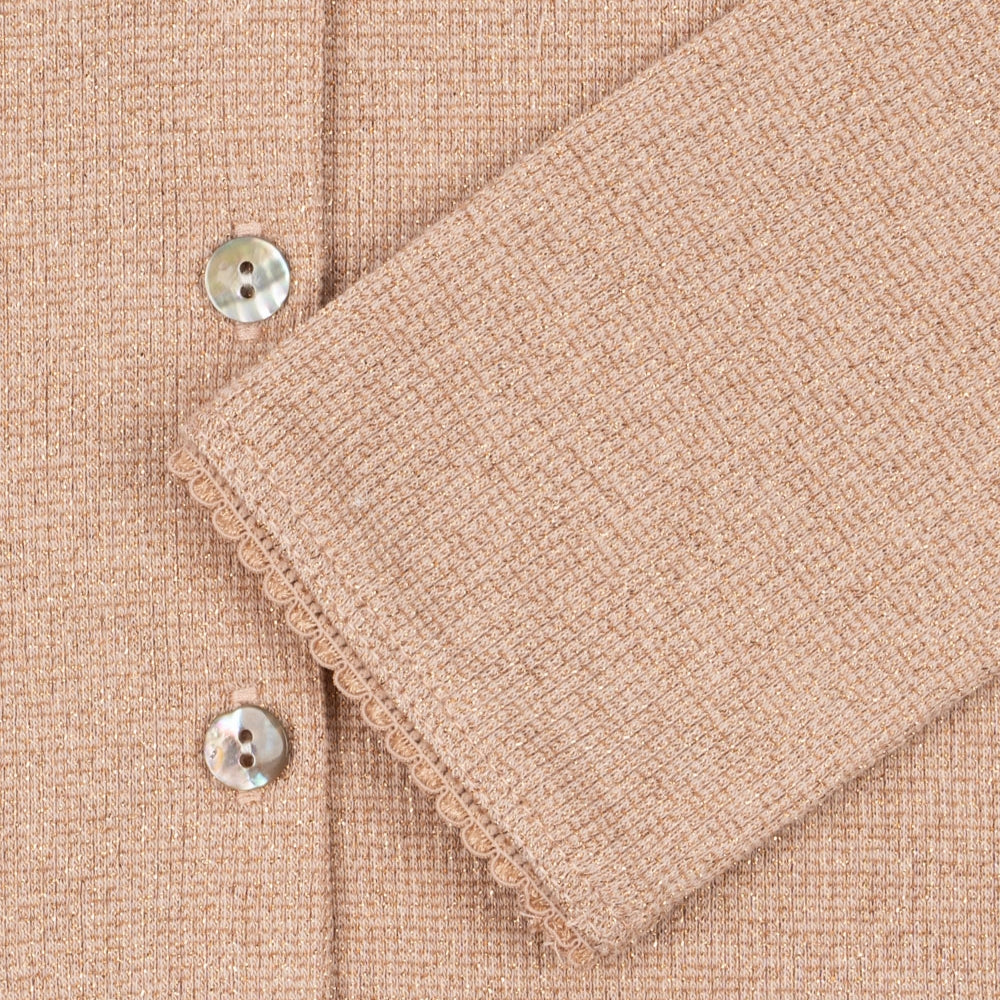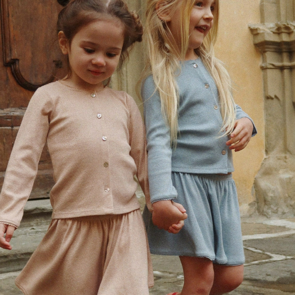 A klasszikus szabás kerek nyakkivágással, finom bordázattal és elegáns gyöngyházgombokkal teszi a lányoknak szánt pulóvert a mindennapi és az elegánsabb ruhákhoz egyaránt tökéletesen illővé.