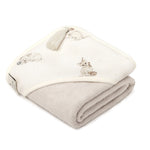 A kapucnival ellátott Memi bébi törülközőt bordázott szegély zárja.