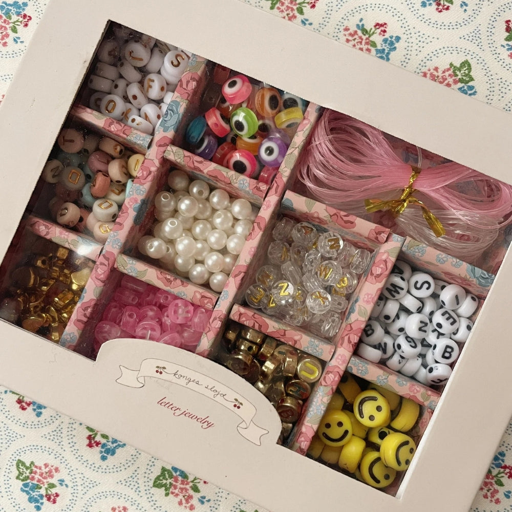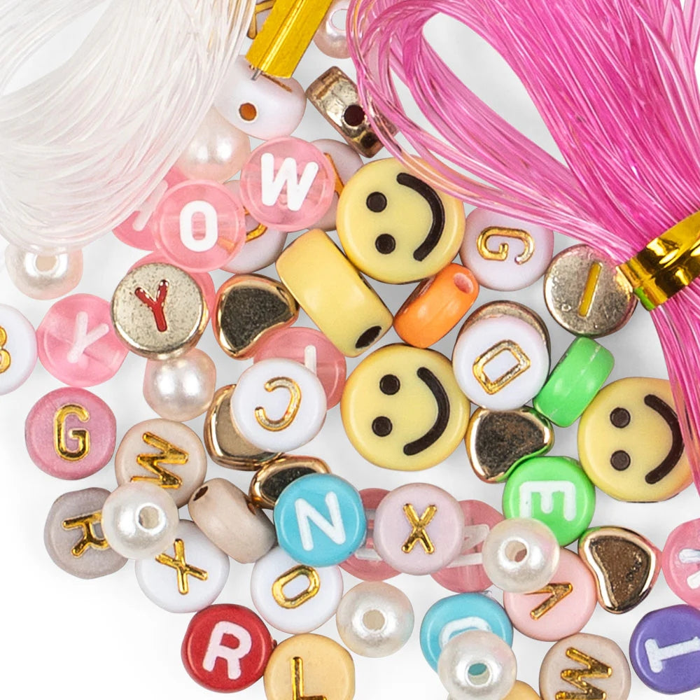 A Konges Slojd ékszerkészítő készlet átlátszó és rózsaszín nejlonzsinórt, 60 betűgyöngyöt és 25 mosolygós arcú gyöngyöt tartalmaz, hogy vidám és bájos legyen.