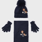 A szett visszafogott, tengerészkék színben pompázik, így számos téli öltözékhez illik.