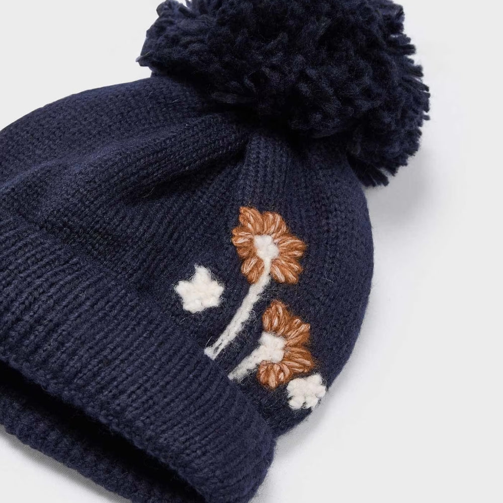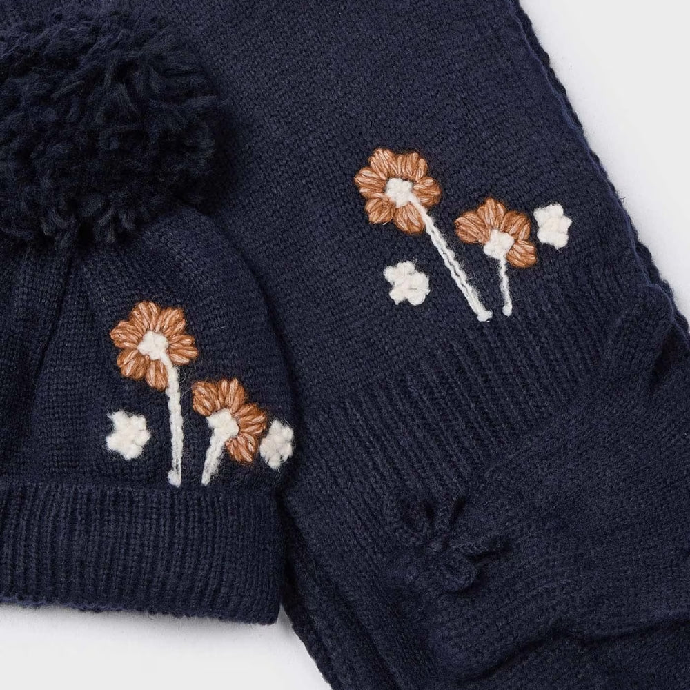 A sapkát aranyos pom-pommal és a sálat finom virágmotívummal díszítettük, ami tovább növeli az általános kislányos bájt.