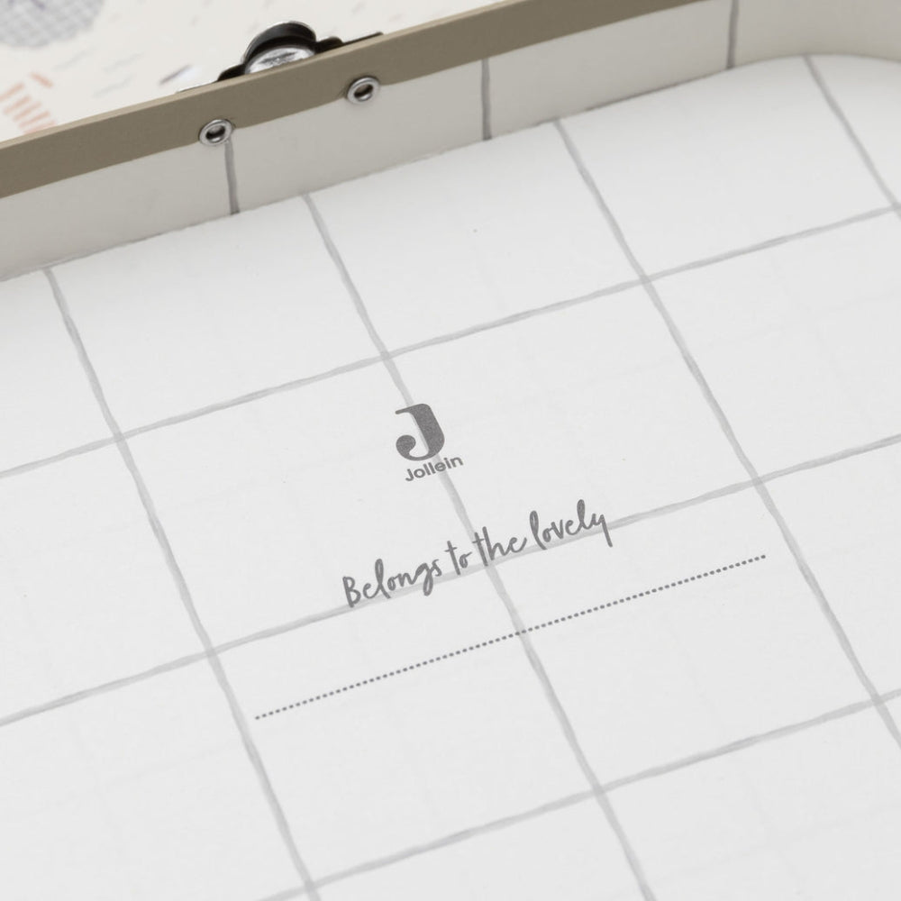 A belseje klasszikus kockás mintával és a "belongs to" aláírás számára kialakított hellyel van ellátva, így gyermeke bárhová magával viheti a készletét.