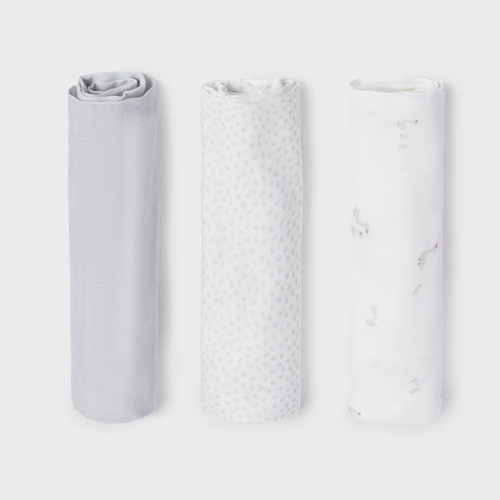 A Mayoral szett három pelenkát tartalmaz a fehér, a szürke és a divatos szürke pöttyös színekben, hogy bármilyen pelenkához illeszkedjen.