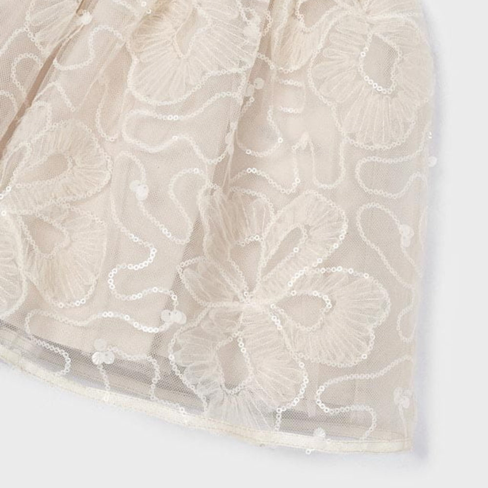 A Mayoral márka modellje krémszínű és légies tüllel örvendeztet meg, amely mozgás közben gyönyörűen elrendeződik.