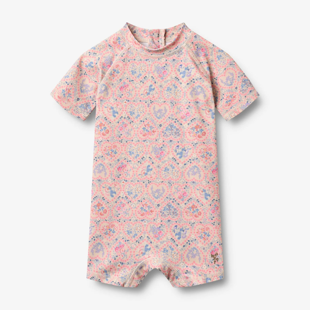 Wheat Rövid ujjú gyermek úszódressz Cas rózsaszín szív virágok