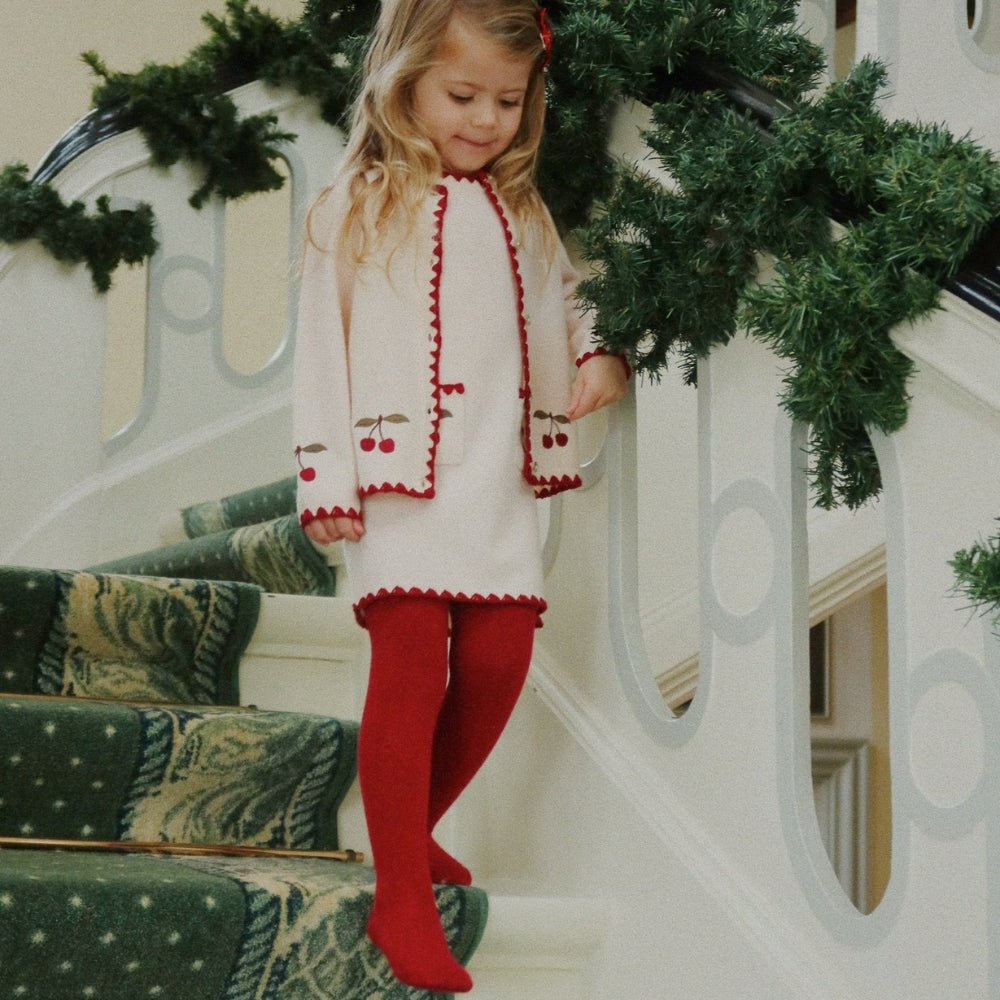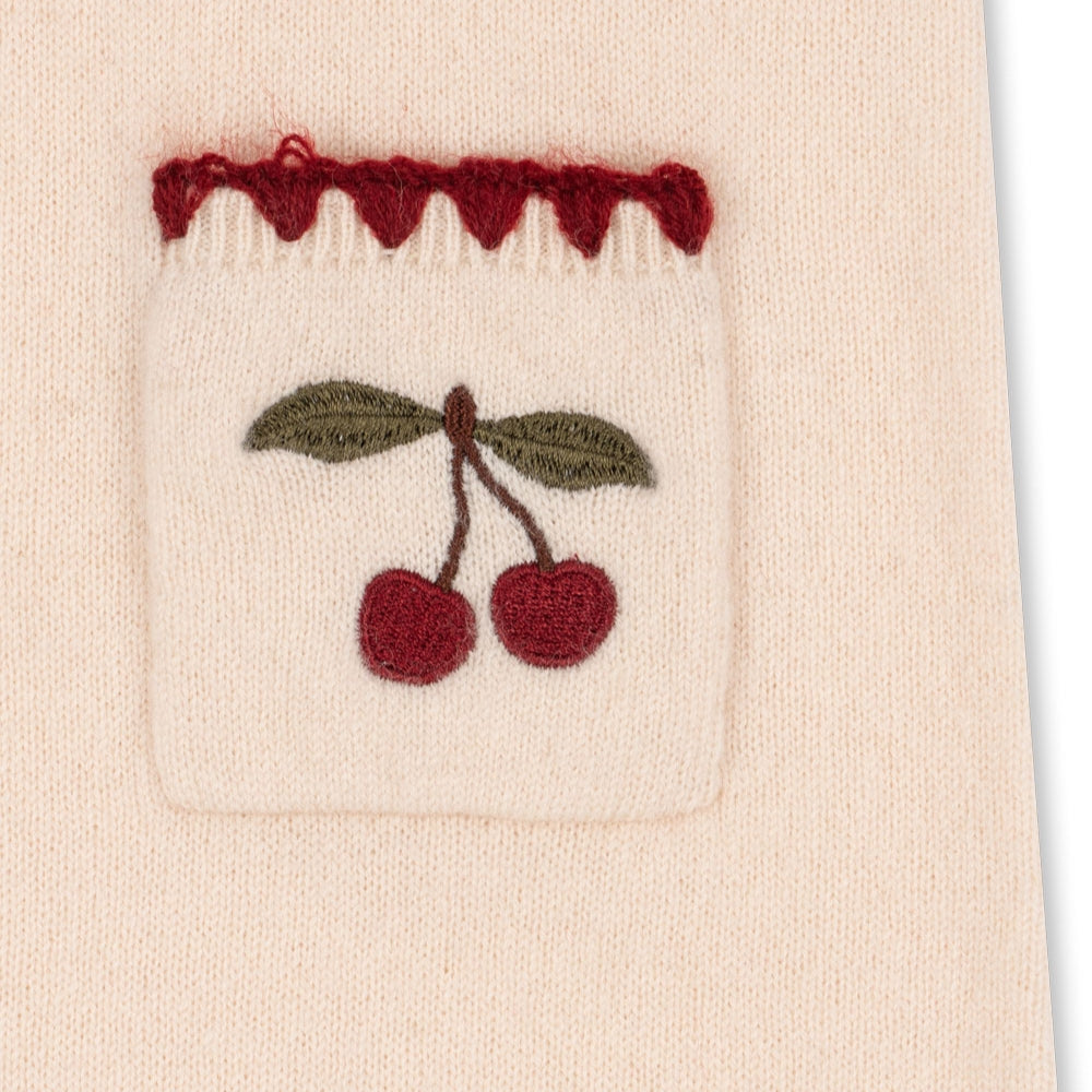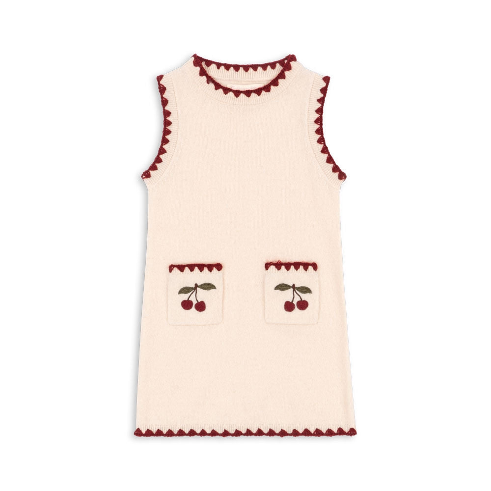 A finom hímzett cseresznyék bájt és karaktert kölcsönöznek, míg az egyenes, enyhén szabott szabás azt jelenti, hogy a lányoknak szánt ruha szépen ül az alakon anélkül, hogy korlátozná a mozgást. Az elülső praktikus zsebek funkcionalitást kölcsönöznek, így ez a modell tökéletes a mindennapokra és a különleges alkalmakra egyaránt.