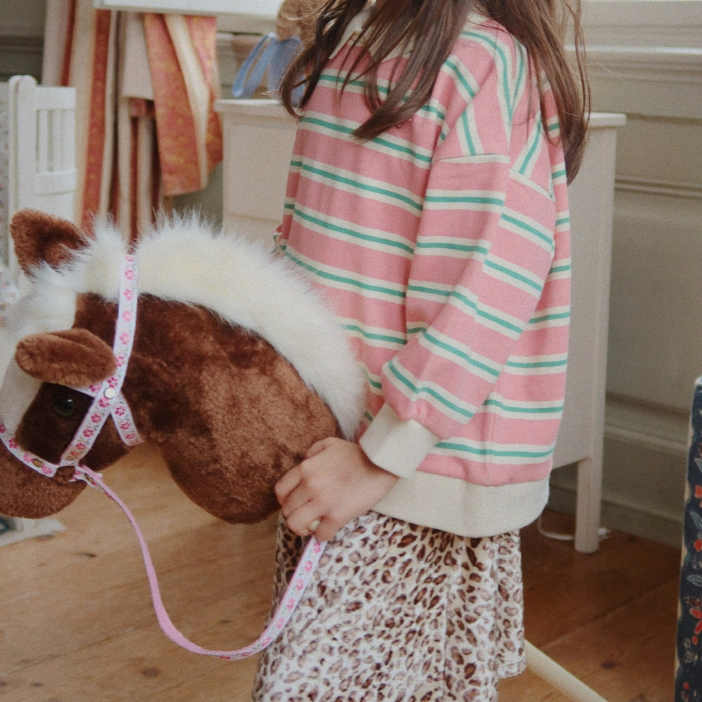 Ez a gyermekpóló laza, melegítőfelső-ihlette szabású, gallérral, leengedett vállvonallal és kényelmes bordázott szegélyekkel.