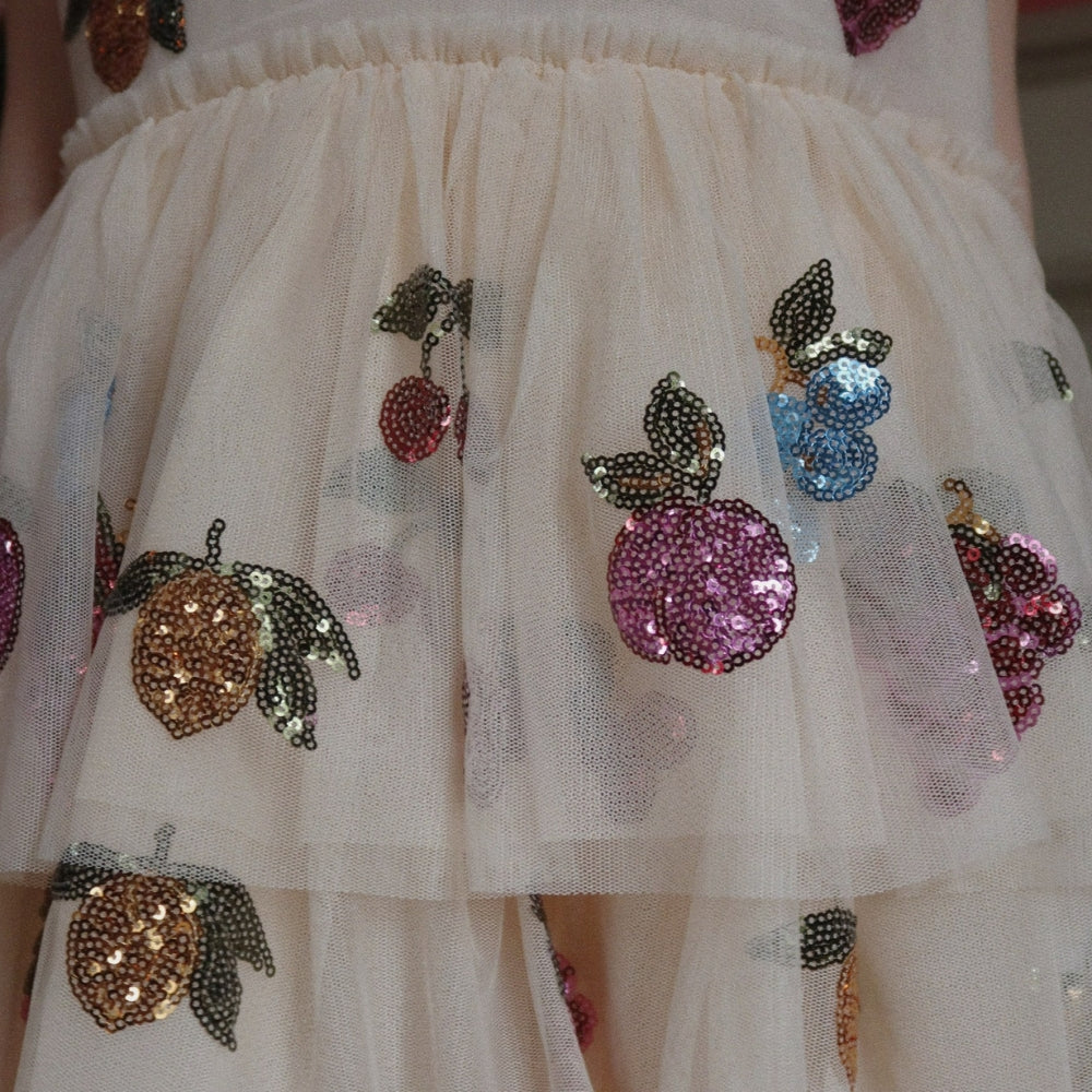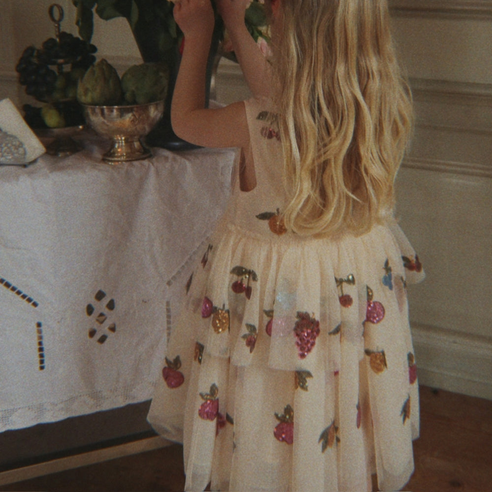 A Konges Slojd Yvonne lányruhája egy csillogó, mesebeli ihletésű választás a táncolni és forogni szerető kis tündérek számára.