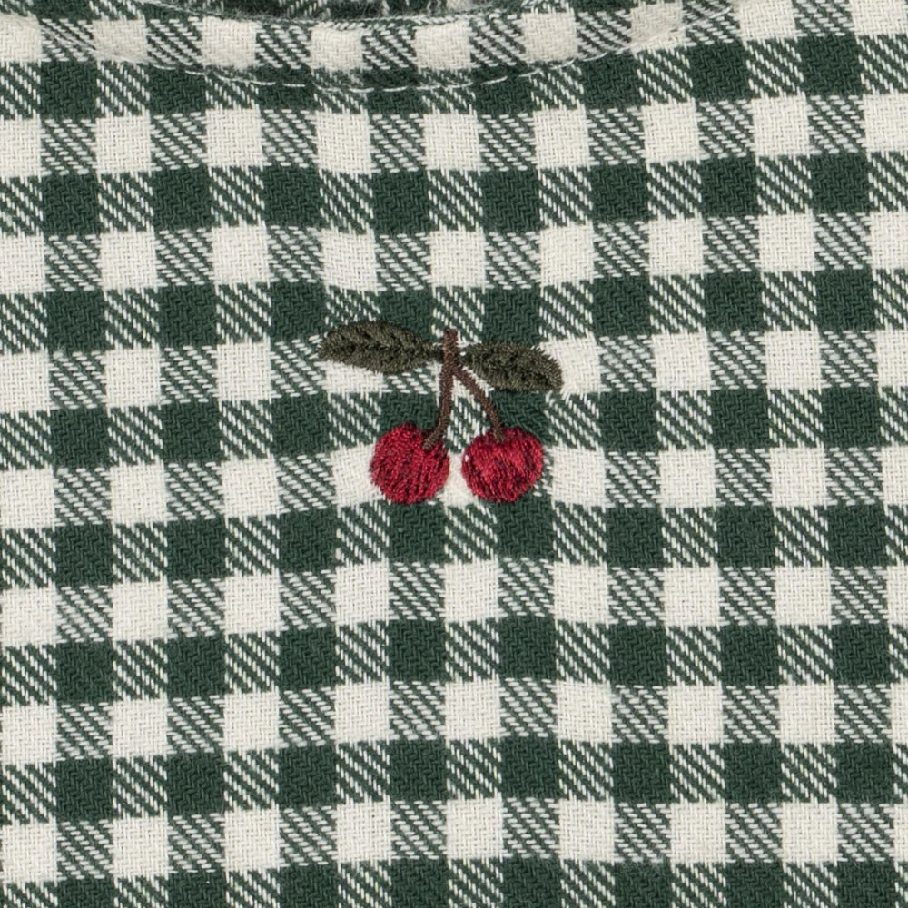 A klasszikus zöld és krémszínű kockás minta időtlen bájt kölcsönöz, míg az elöl hímzett cseresznye a márka finom, jellegzetes részlete.