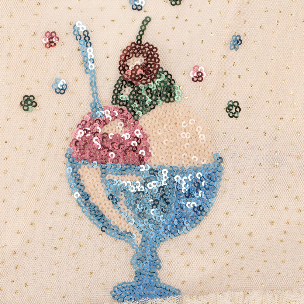A modellt flitterekkel díszített dekoratív hímzés díszíti, ami elegáns jelleget kölcsönöz neki anélkül, hogy elveszítené gyermeki könnyedségét.