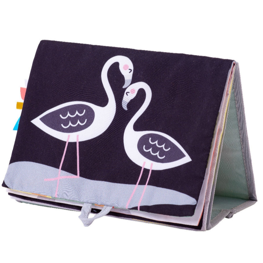 A taf toys puha, interaktív könyvecskéje babáknak, két oldallal két fejlődési szakaszra, kiságyban, babakocsiban és pocakos játékhoz.