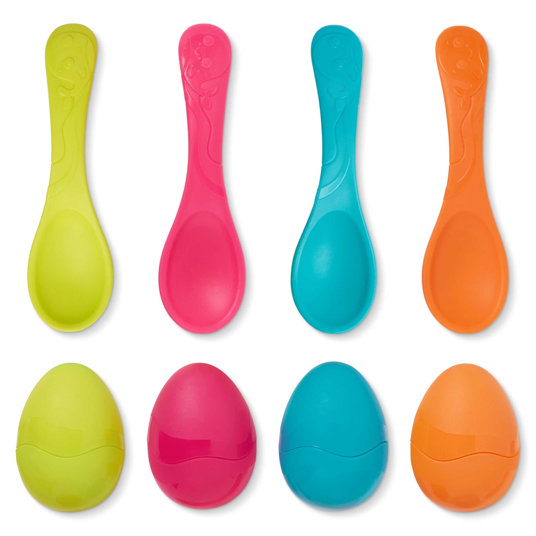 A készlet négy ergonomikus kanalat tartalmaz érzékszervi dudorokkal és négy, egymáshoz illő színű tojást, mindegyik tojás két félből áll, így a belsejébe konfettit vagy egy kis meglepetést (nem tartozék) is tehetsz, hogy fokozd az izgalmakat.