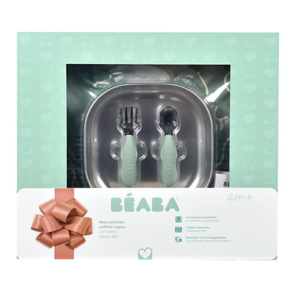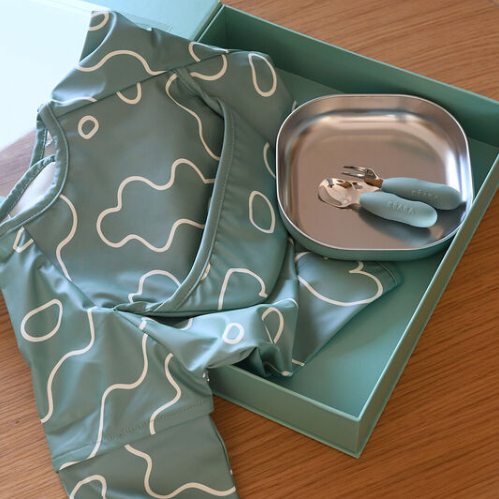 Beaba Beaba Első étkezés ajándék szett 3in1 tányér + evőeszközkészlet + mellény Zsályazöld