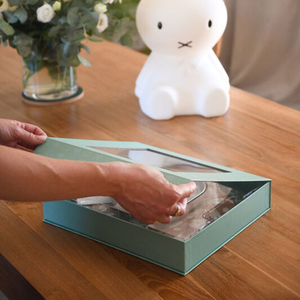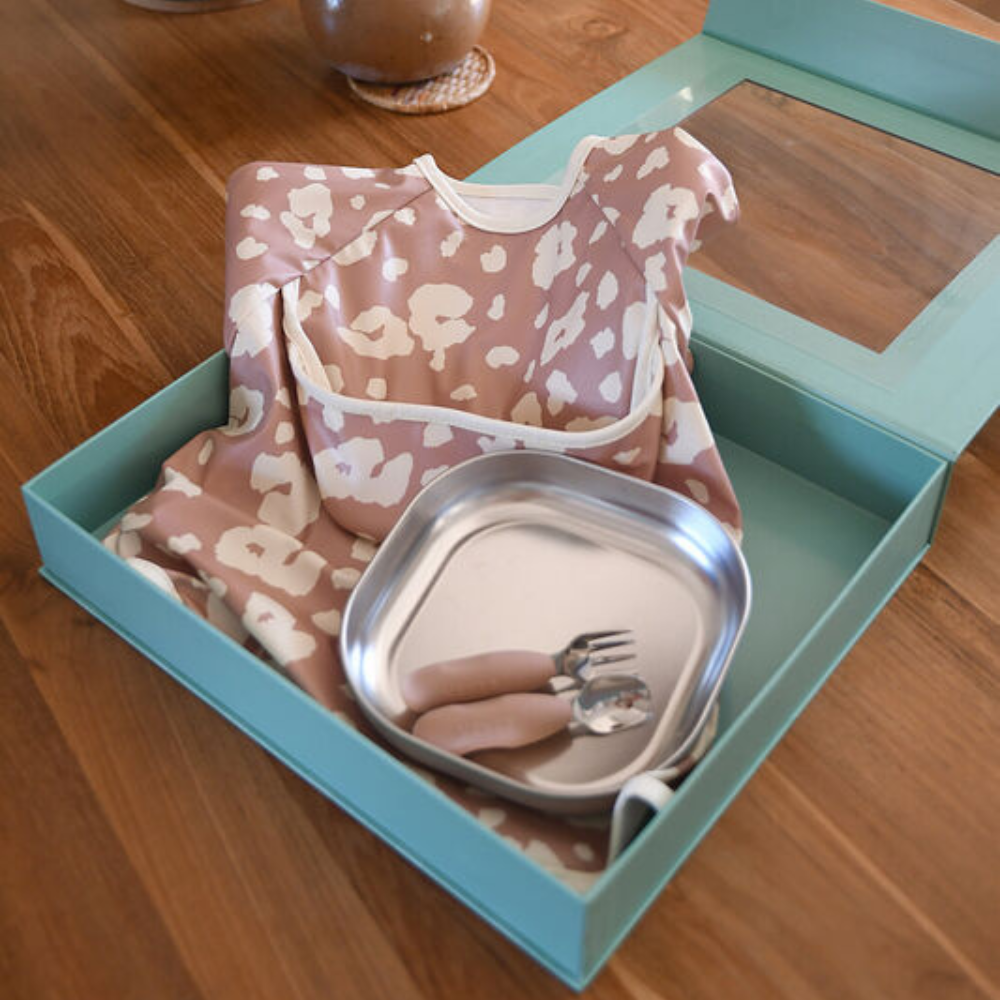 Az elegáns és teljes szett 4 hónapos kortól tartalmaz egy tányért, egy gyakorló evőeszközt és egy ujjas melltartót, tartós emlékdobozba csomagolva.