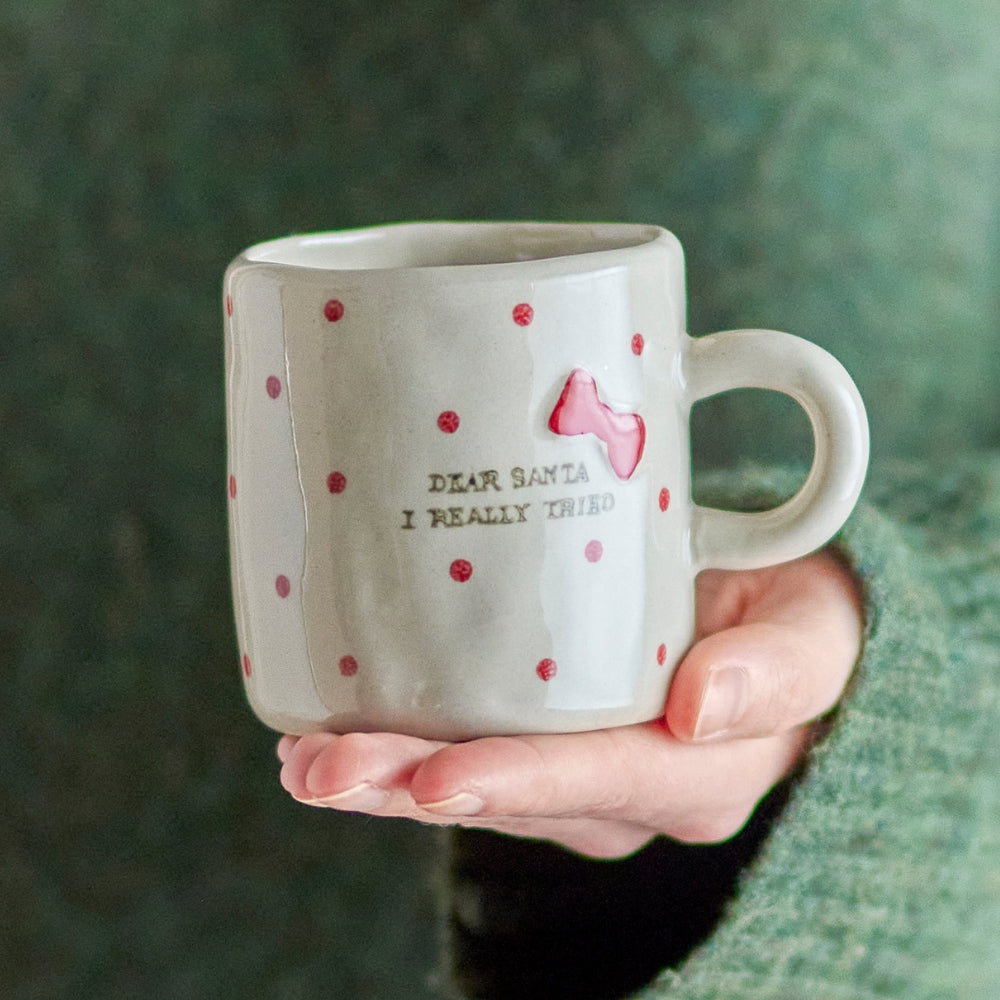 A bájos "Kedves Mikulás, én tényleg megpróbáltam" felirat és a kézzel festett piros részletek minden bögrét egyedivé tesznek.
