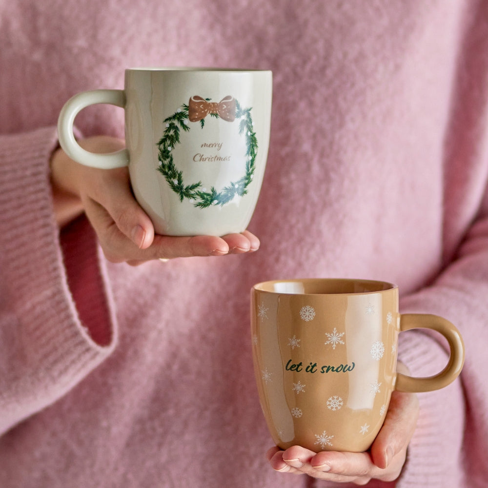 A készlet két kőedényből készült kávésbögrét tartalmaz, amelyeket imádnivaló motívumok díszítenek - az egyiken a "Let it snow" felirat látható hópelyhekkel körülvéve, a másikon pedig egy klasszikus füzér a "Merry Christmas" felirattal.