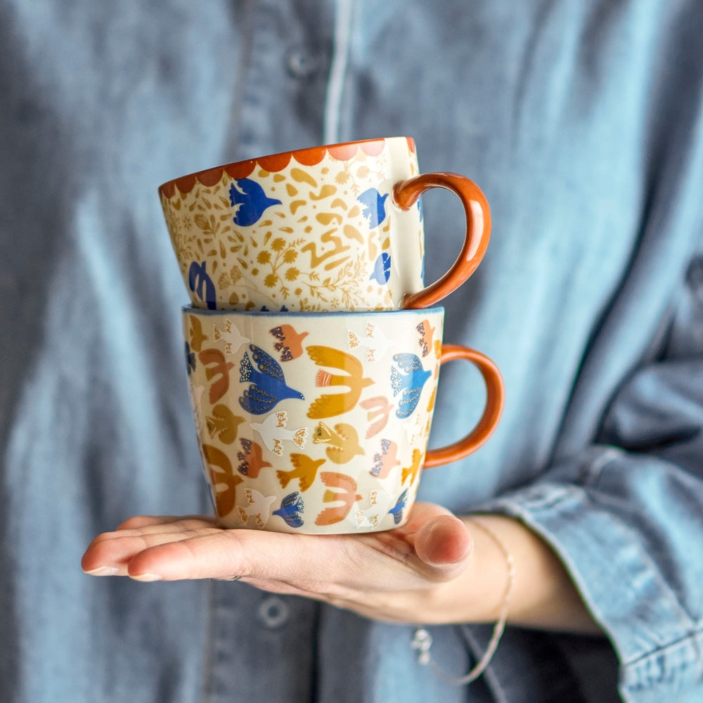 A készlet két bögrét tartalmaz, amelyek kőedényből készültek, és grafikus motívummal díszítettek, meleg tónusokban.