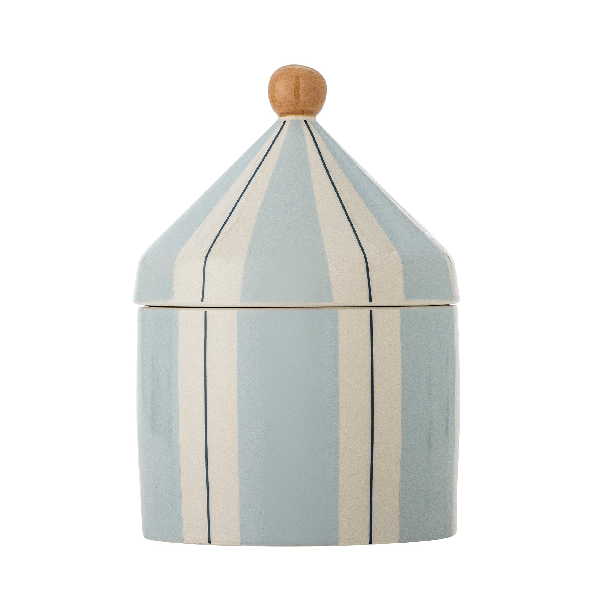 A tárolóedény aranyos cirkuszi sátor formájú, kék és fehér csíkokkal díszített kőedényből készült.