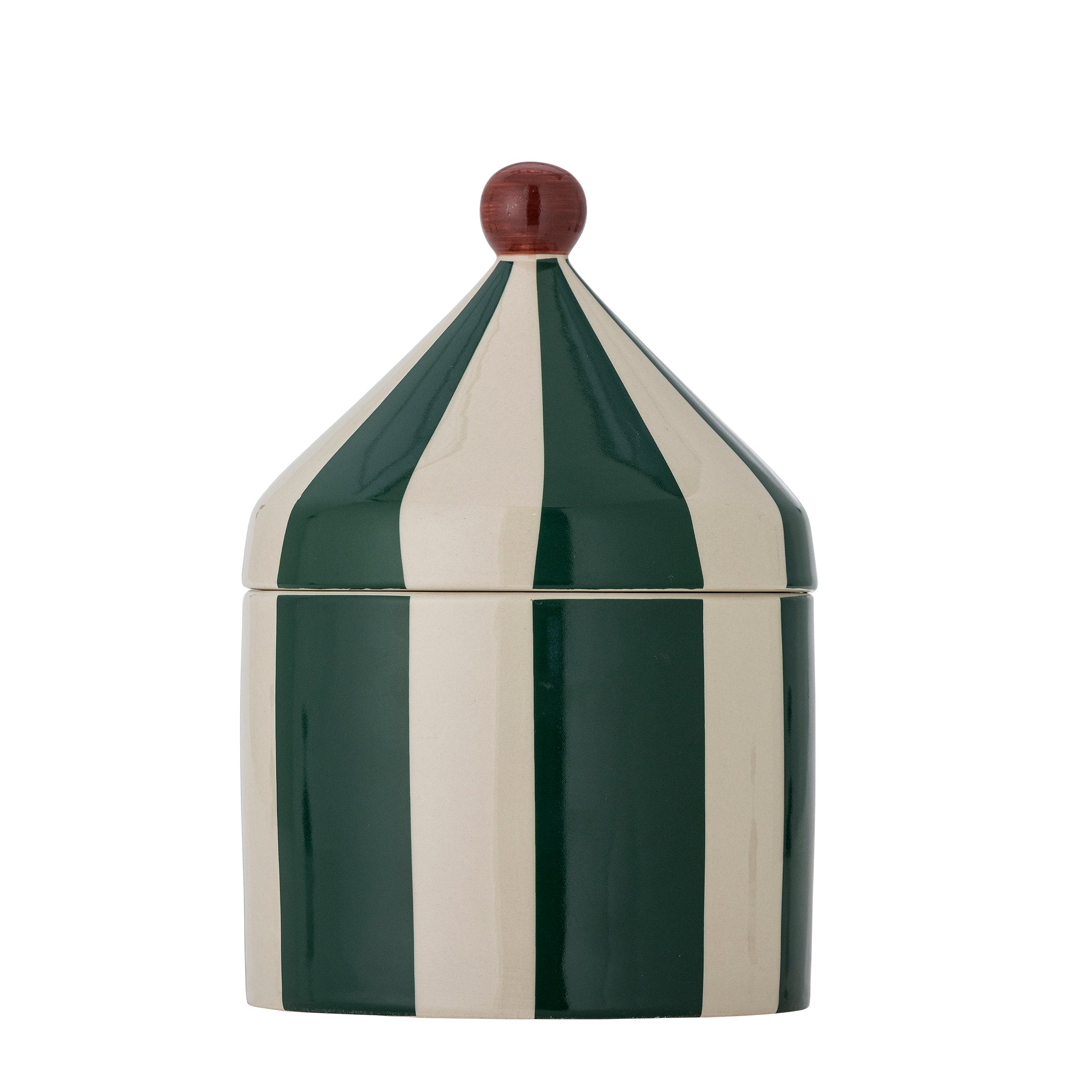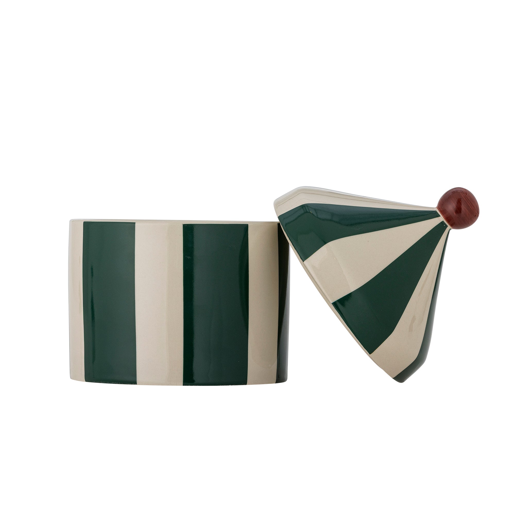 A tárolóedény aranyos cirkuszi sátor formájú, kék és fehér csíkokkal díszített kőedényből készült.