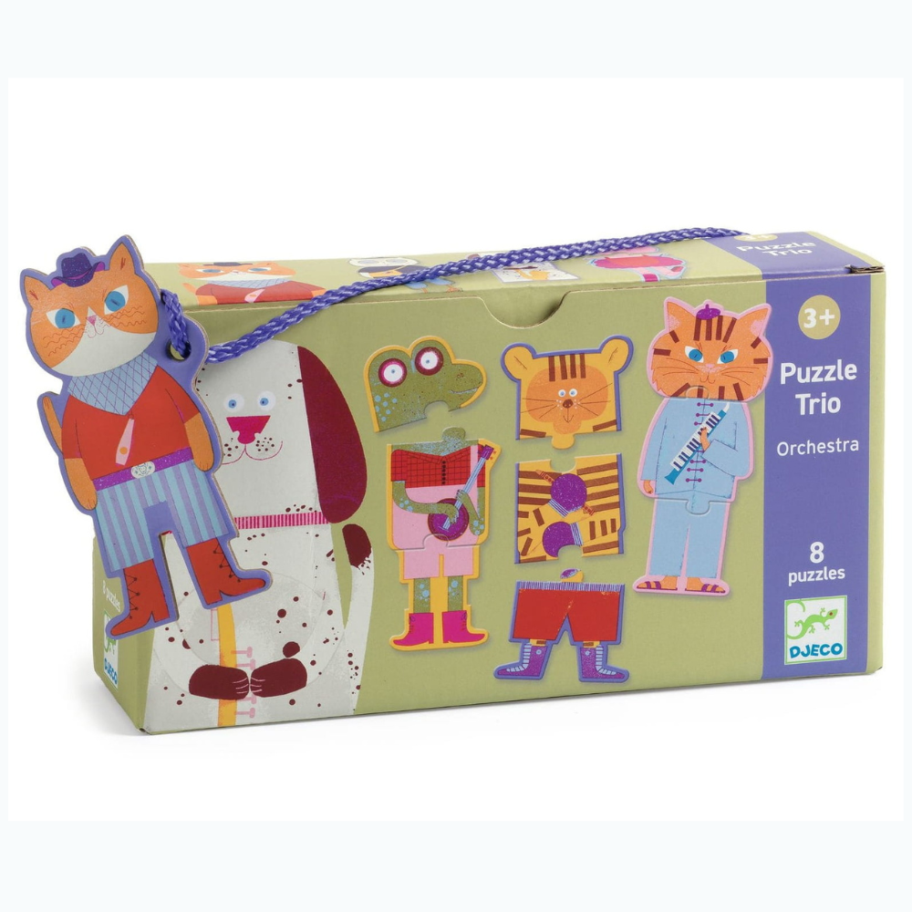 A Djeco zenei puzzle egy imádnivaló készlet a kicsiknek, amelyben különböző hangszereken játszó állatok szerepelnek.