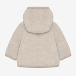 A modell praktikus kerek kapucnival, hosszú ujjakkal és puha bordás szegélyekkel rendelkezik a nyílásoknál, hogy távol tartsa a hideget.