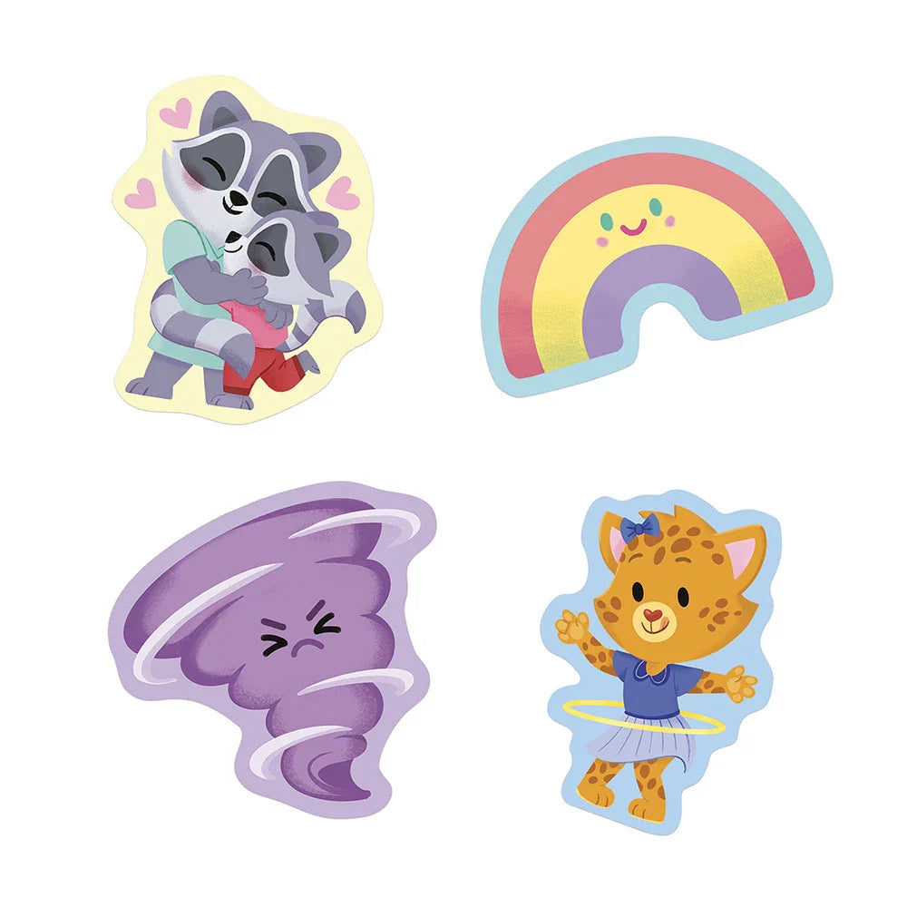 Belül állatok és a természet elemei várják, hogy különböző érzelmeket, például örömöt, dühöt, meglepetést vagy szomorúságot mutassanak, így a matricák segítenek gyermekednek megnevezni az érzéseket és a saját módján kifejezni azokat.