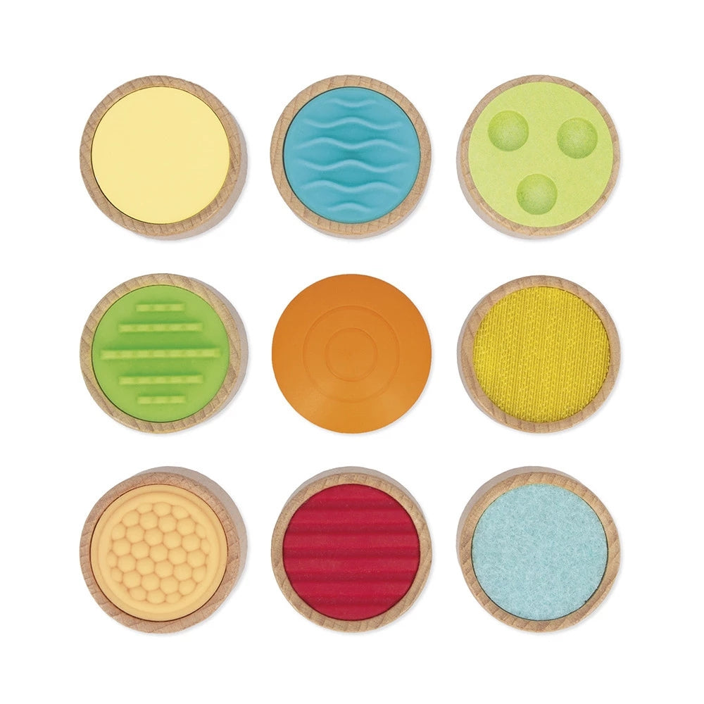 A készlet 9 különböző felületű fadarabot tartalmaz, köztük filc, tépőzár, szilikon, valamint sima és texturált felületű darabokat, így a Sensory Toy az érintést és az érzékszervi memóriát is igénybe veszi.
