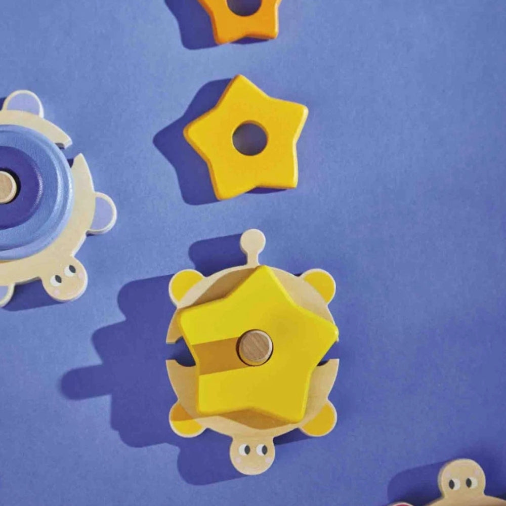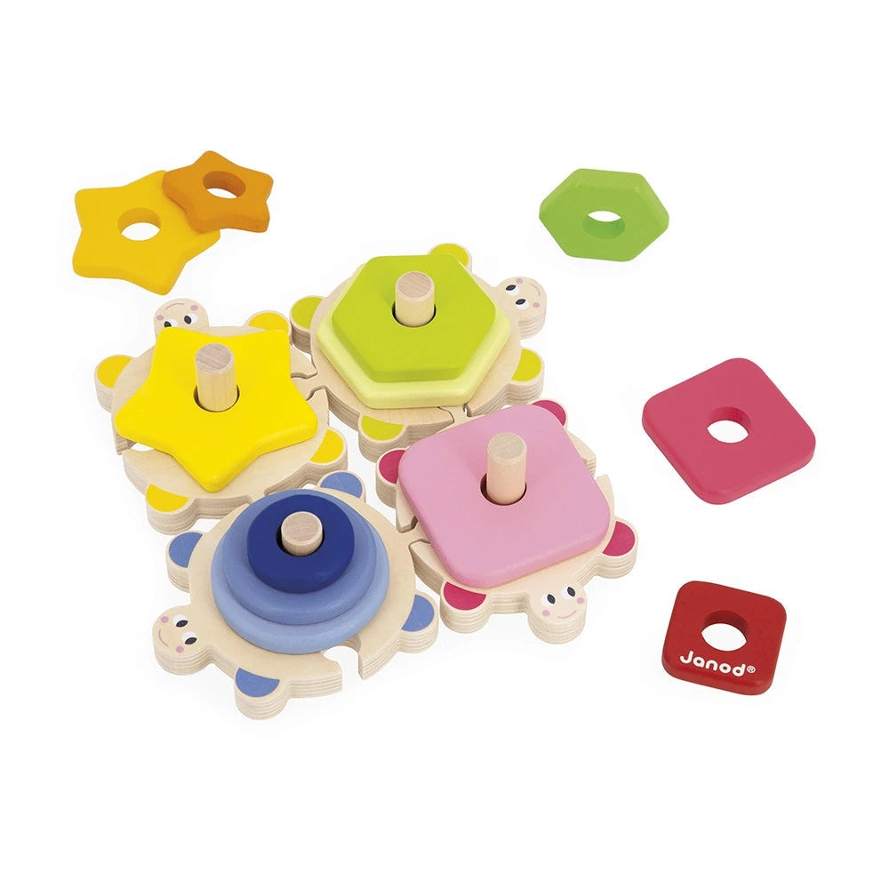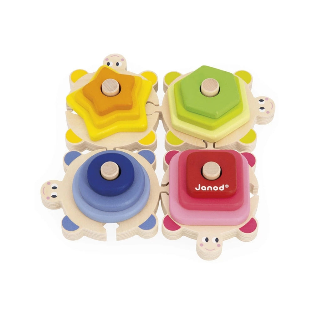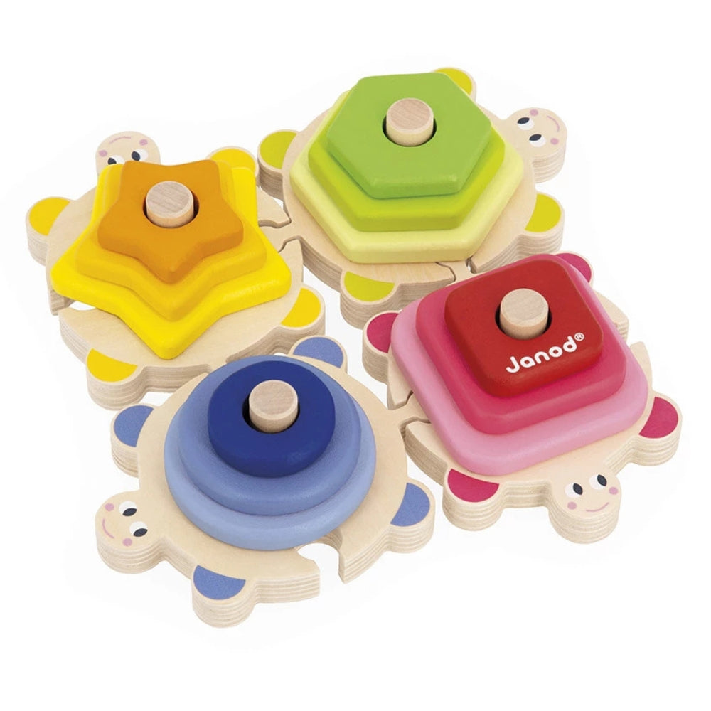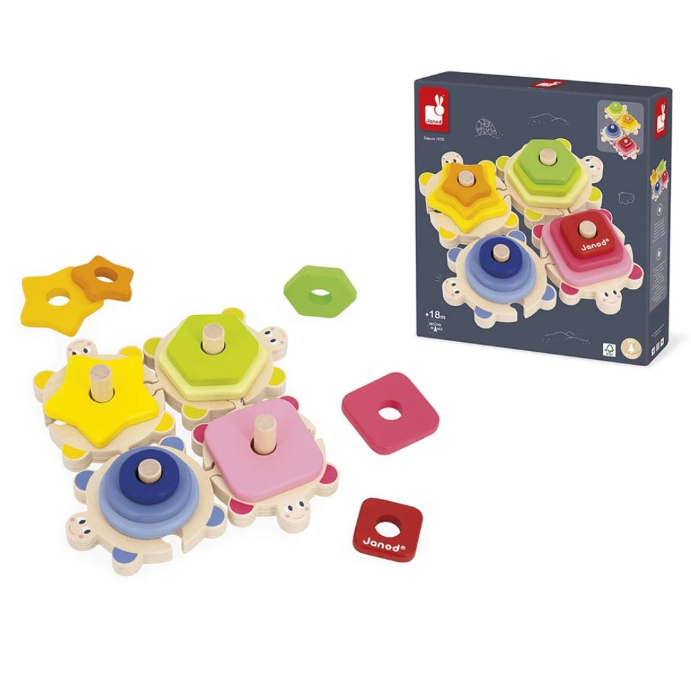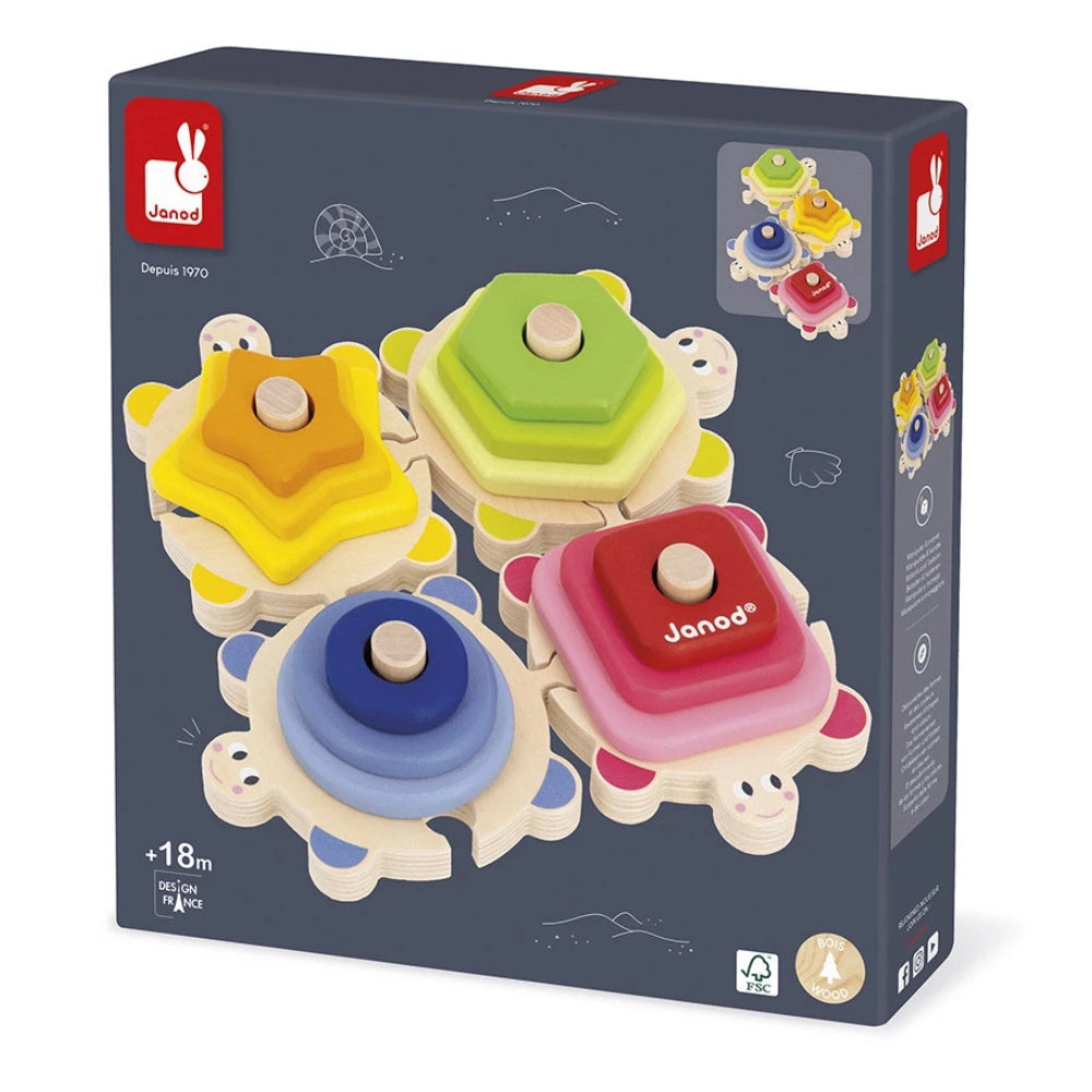 A Janod imádnivaló teknősök formájú fából készült piramisai okos oktatójátékok, amelyek arra ösztönzik a kicsiket, hogy felfedezzék a formákat, méreteket és színeket.