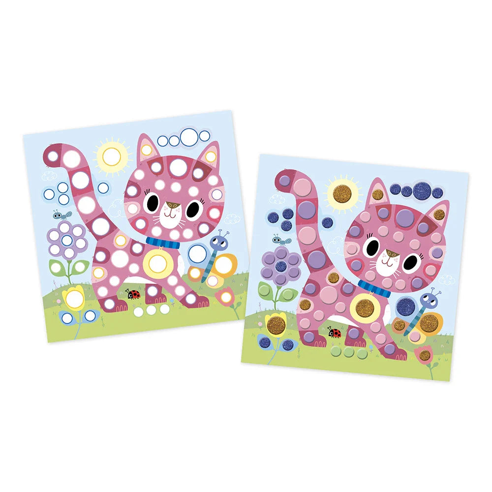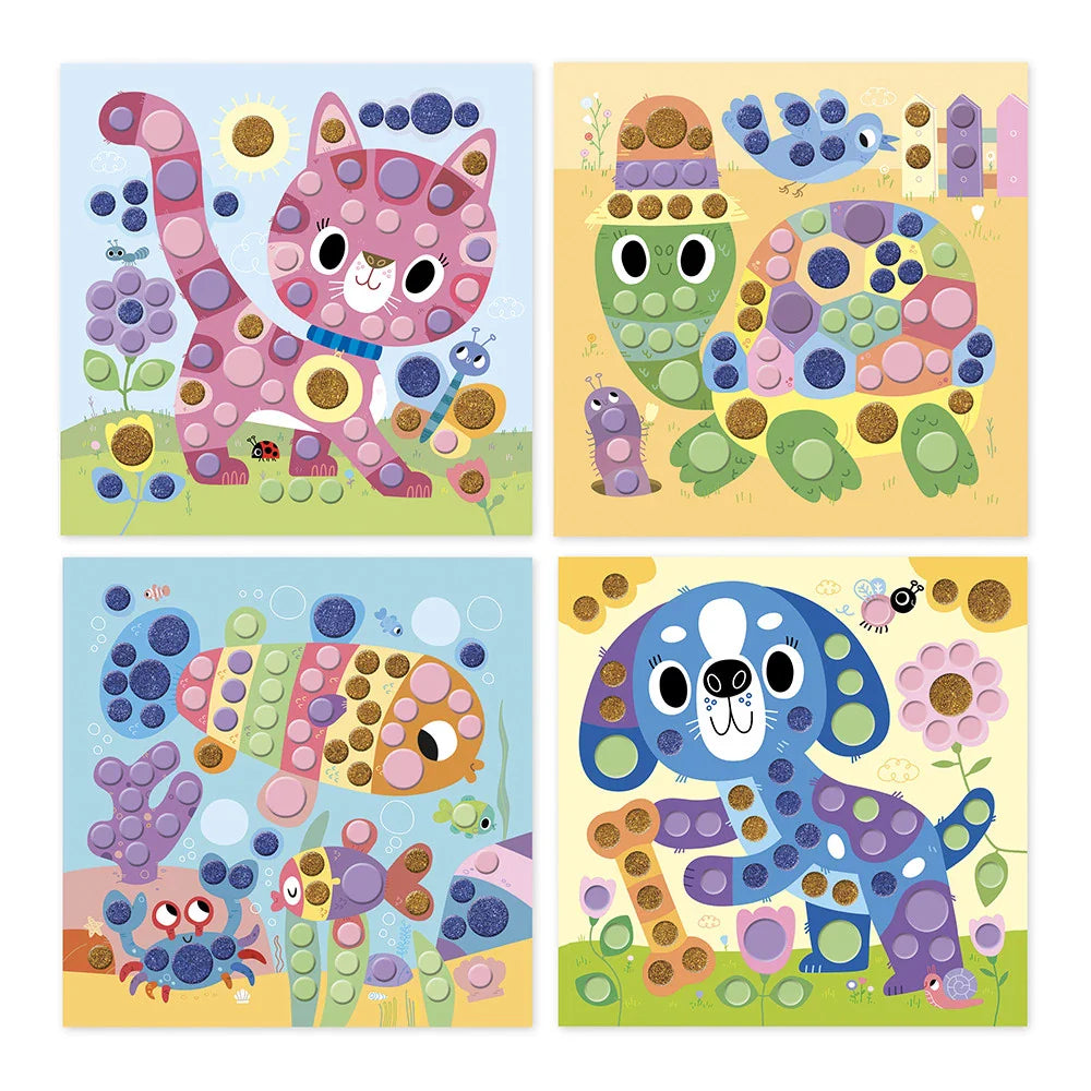 Ezzel a Janod kreatív készlettel a kisgyermekek négy képet díszíthetnek a kerek habmozaikok segítségével, feltűnő és színes illusztrációkat alkotva.