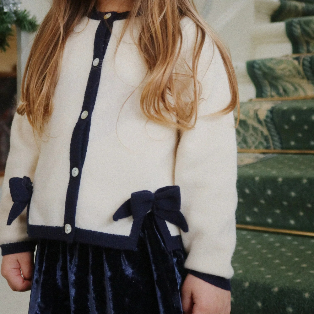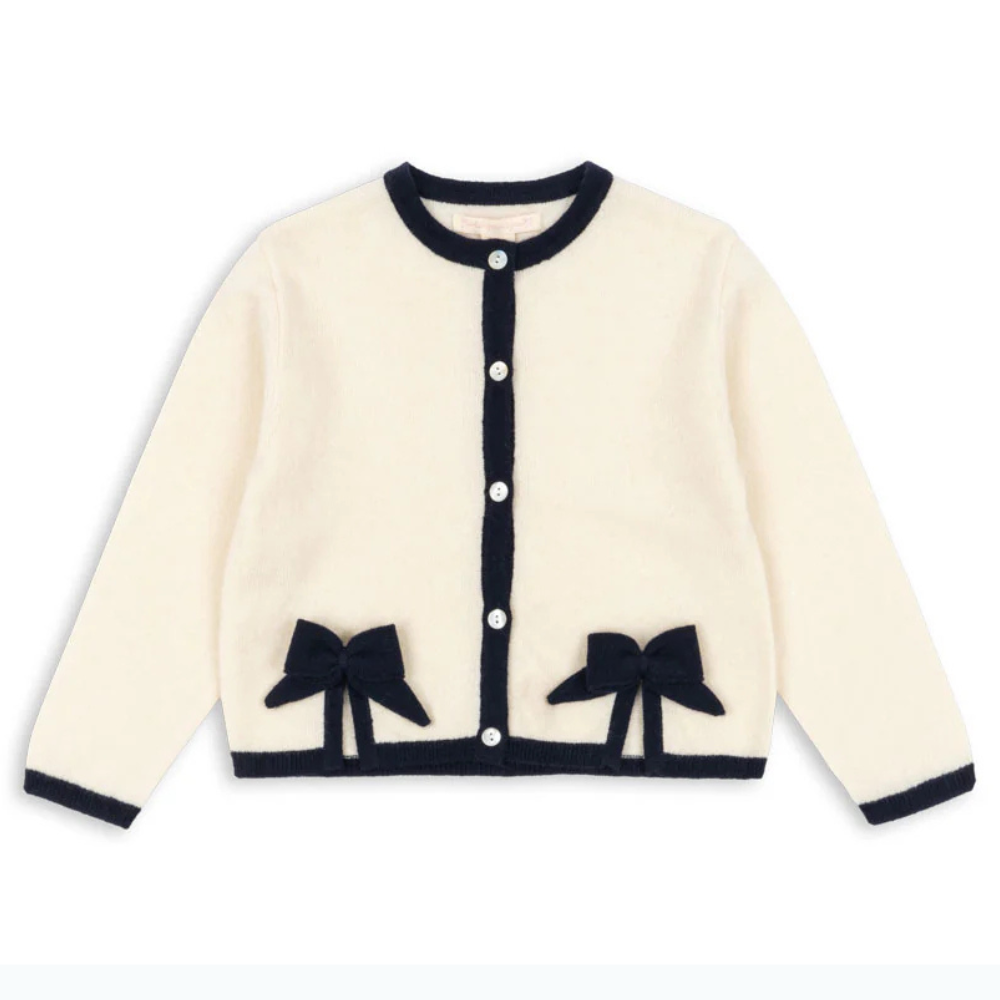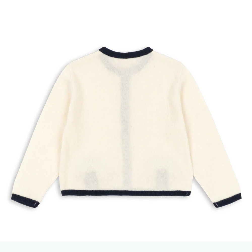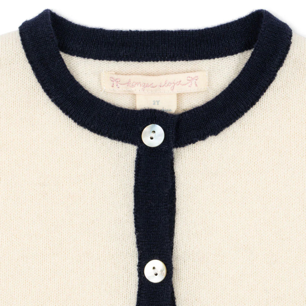 Ez a gyermekpulóver klasszikus szabású, kerek nyakkivágással, kontrasztos csíkozással és gyöngyházgombokkal, a finom masnik finom bájt kölcsönöznek.
