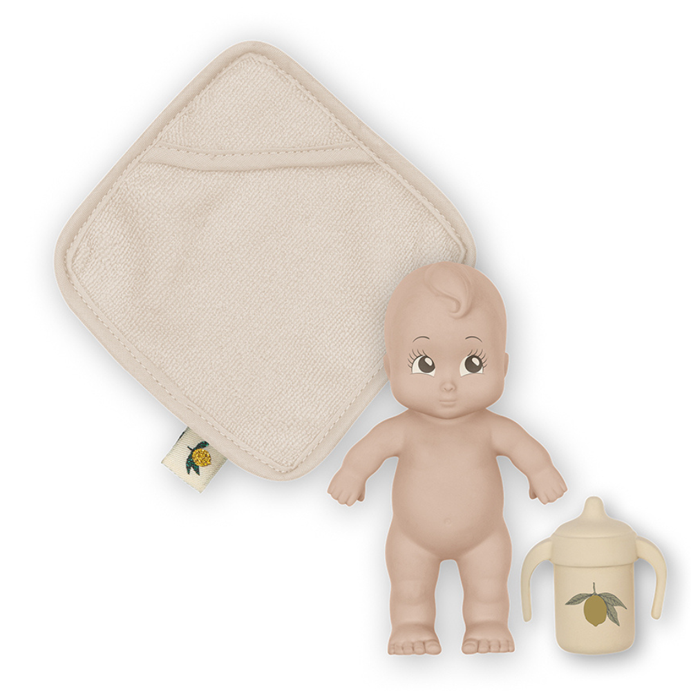 A 100% természetes gumiból készült ilyen baba puha tapintású és tökéletes a kis kezek számára, egy mini törülköző és egy játékpalack is jár hozzá.