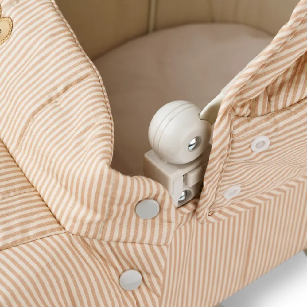 A Liewood babakocsi puha matracot és párnázott tárolókosarat tartalmaz a hordozóágy alatt.