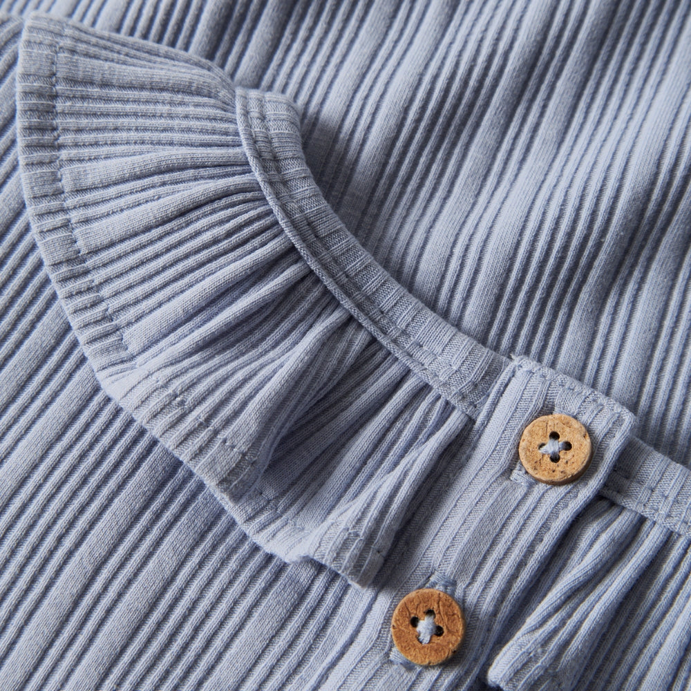 A finom fodor bájos jelleget kölcsönöz neki, míg a kék pasztell árnyalata gyönyörűen kiemeli a gyermek frissességét és természetességét.