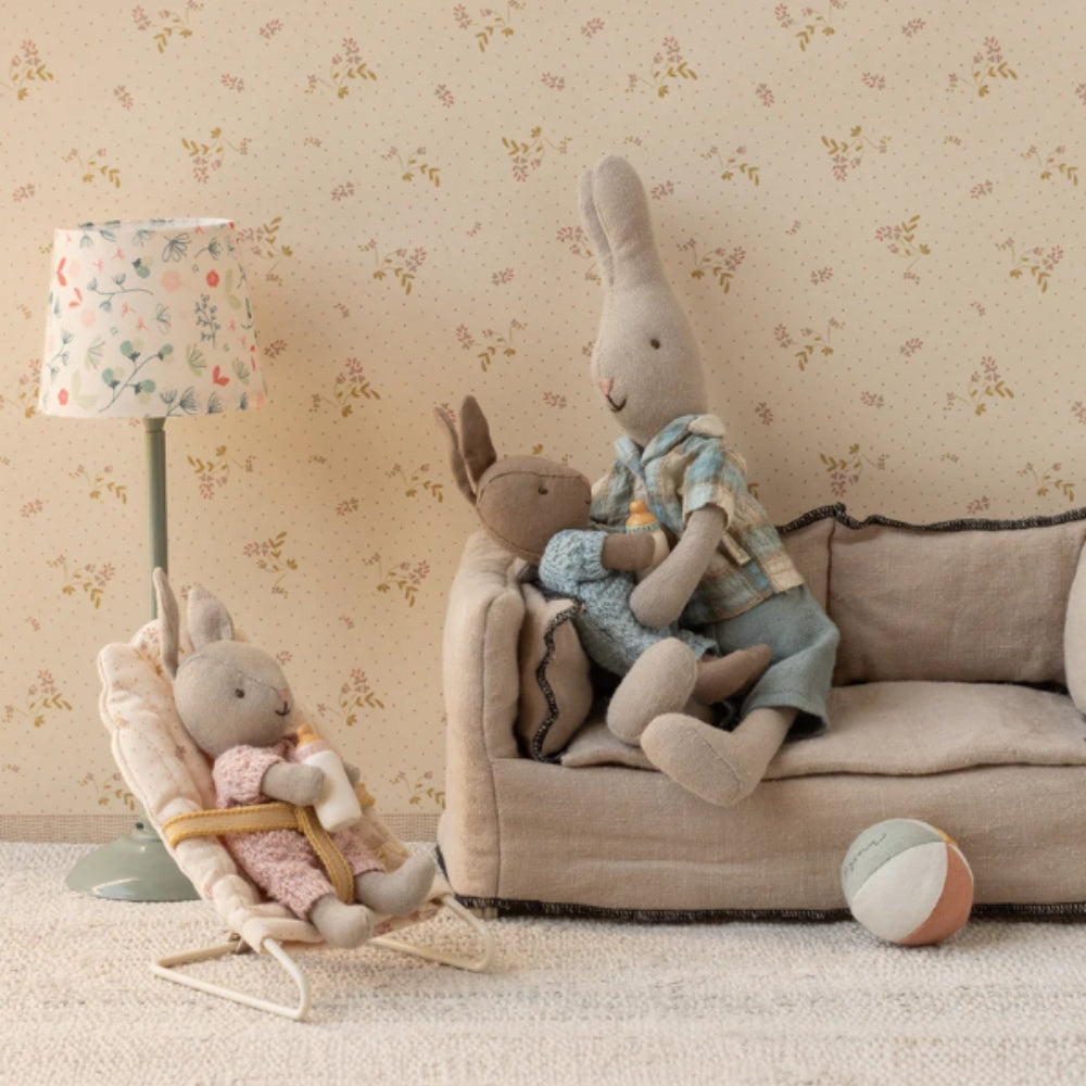 A Maileg nyuszi egyedülálló társ a gyermekek játékához és meséihez. A puha nyuszit úgy tervezték, hogy tökéletesen illeszkedjen a Maileg mikro méretű kiegészítőihez és az ugyanebből a kollekcióból származó babaházhoz.