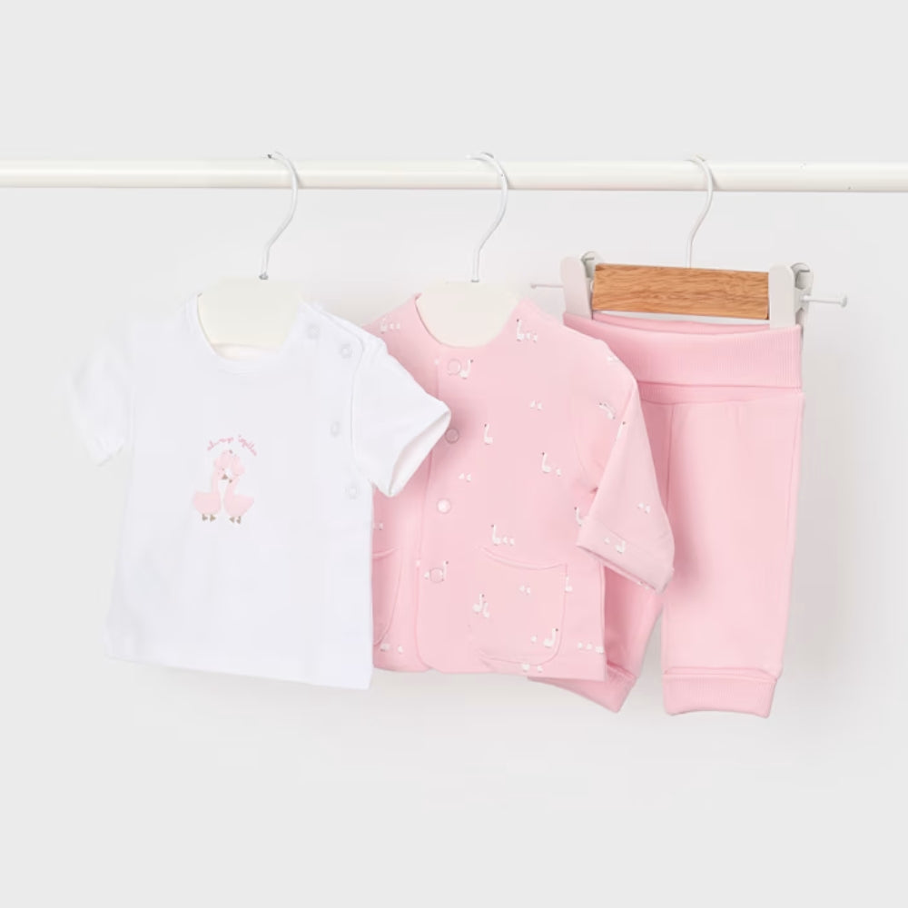 Mayoral baba 3-részes tréningruha szett pulóverrel, nadrággal és pólóval Baby Pink