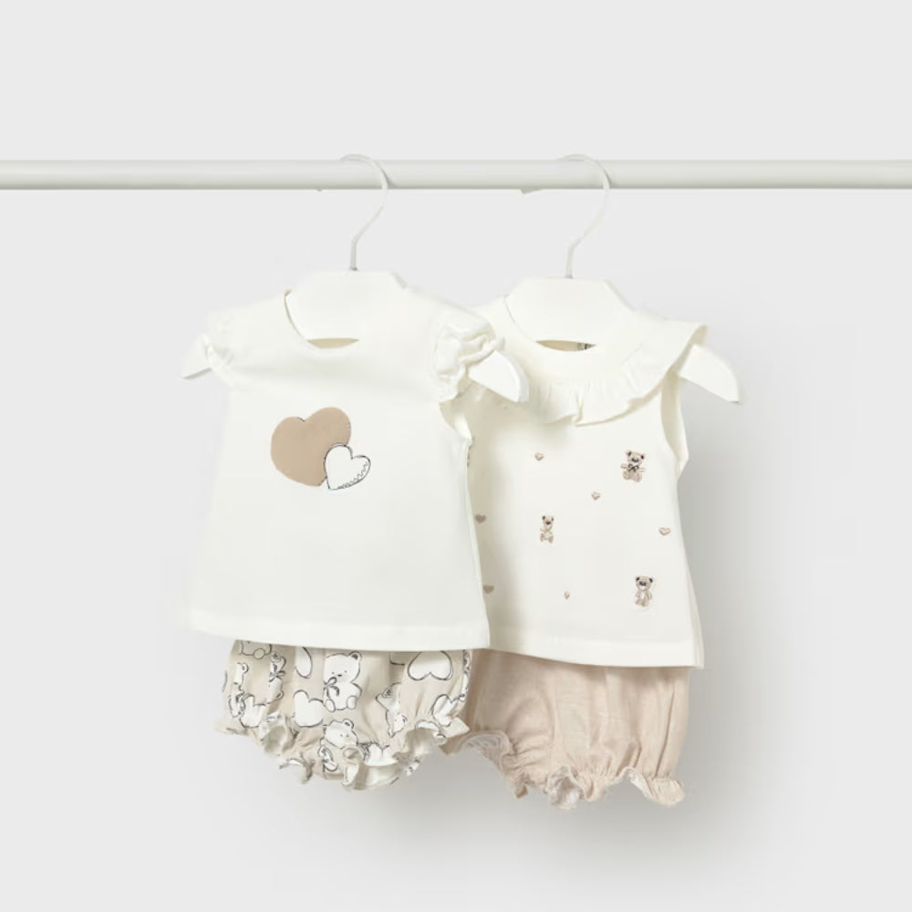 A babaszett két pólóból és két rövidnadrágból áll, így a darabokat könnyen az időjáráshoz és a nap ritmusához igazíthatja.