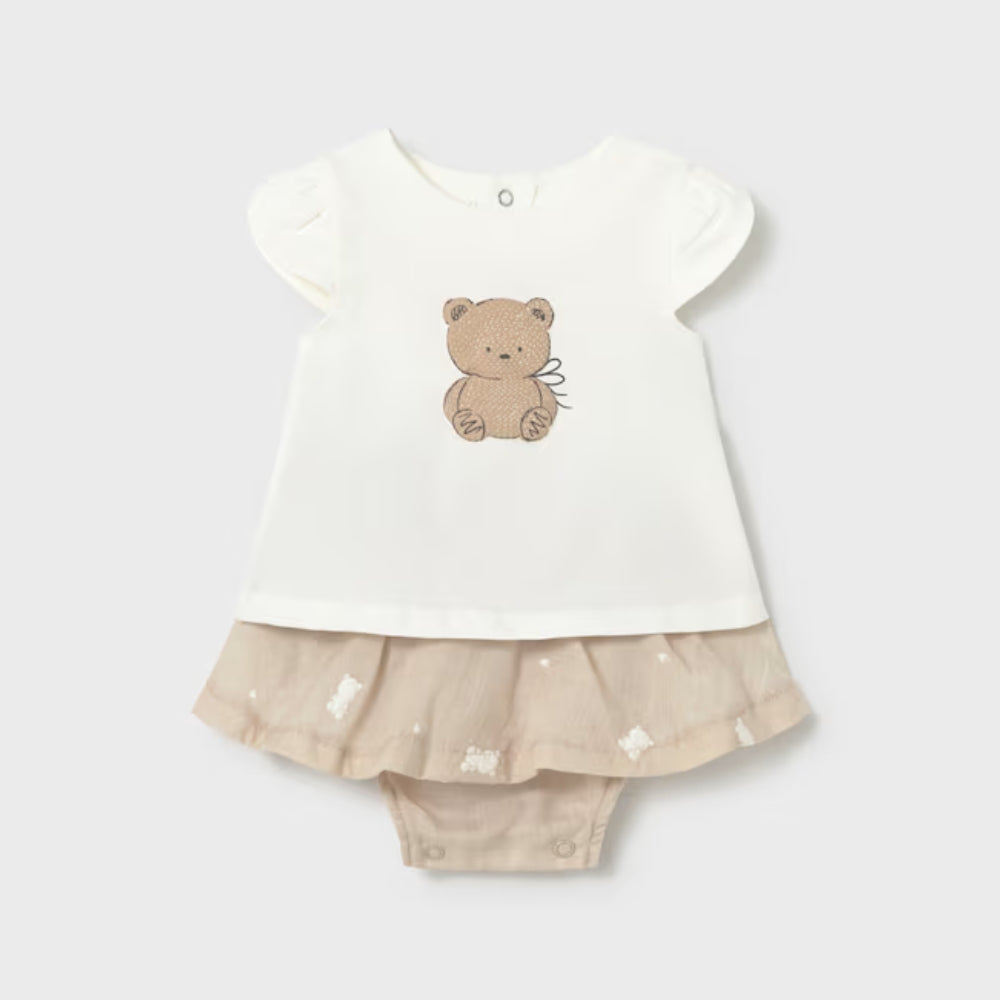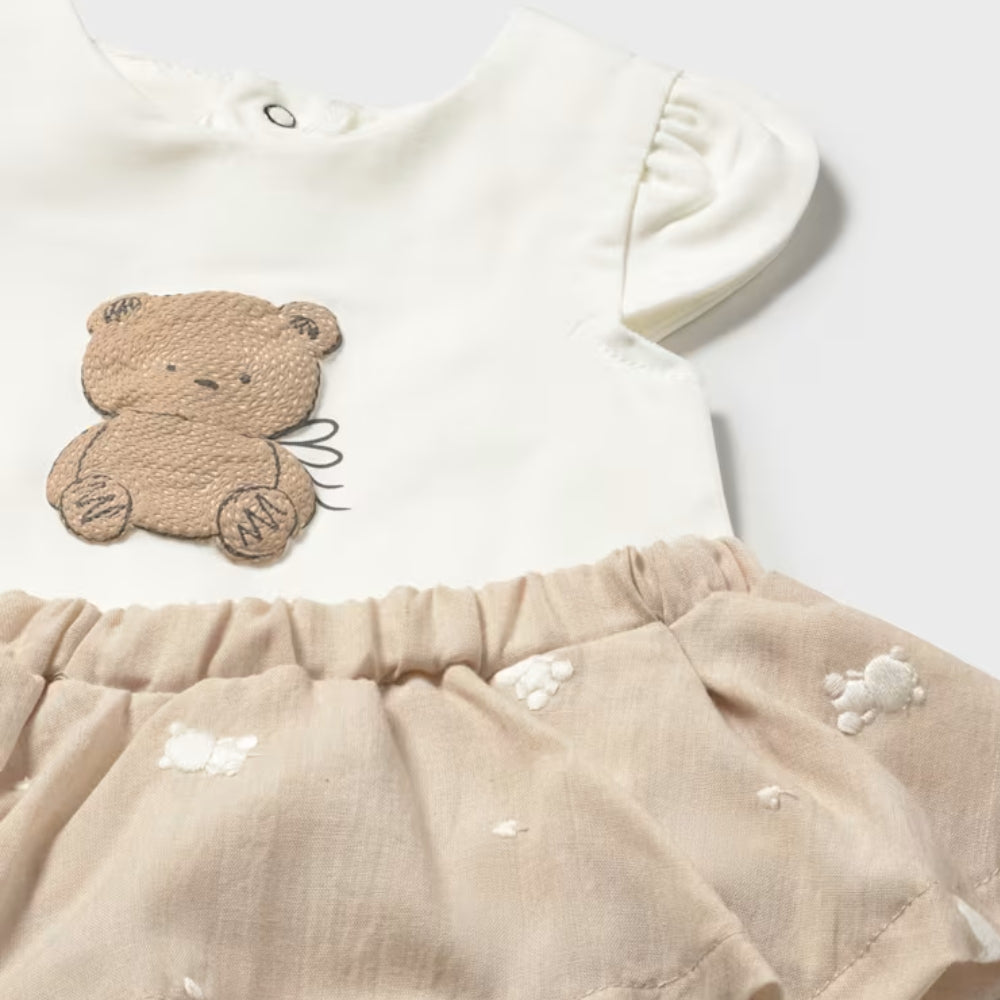 A babakészlet egy szoknyából és egy mackó motívummal ellátott pólóból áll, így azonnal kész stílust teremt, kombinációk nélkül.