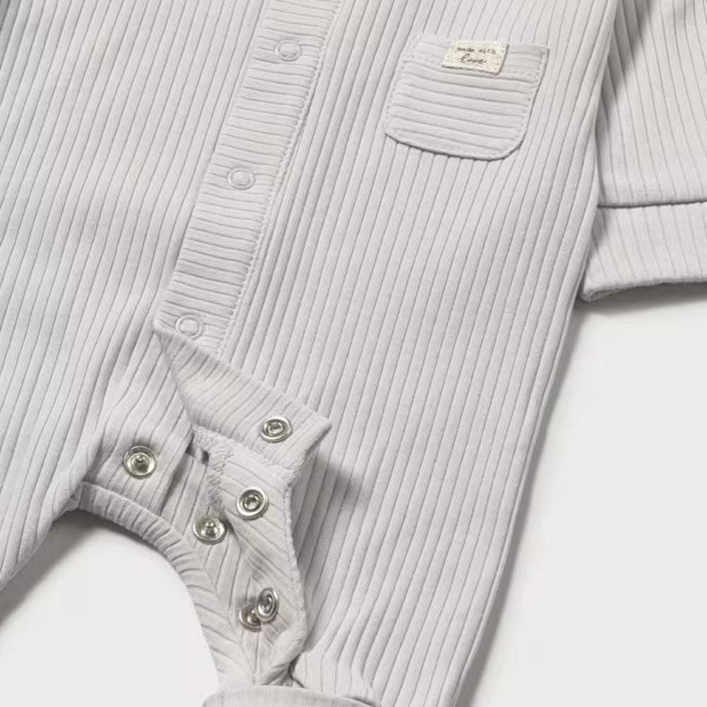 Az újszülötteknek szánt puha pizsama sötét ezüst színben nappalra és éjszakára egyaránt alkalmas, és biztosítja a gyermek szabad mozgását.