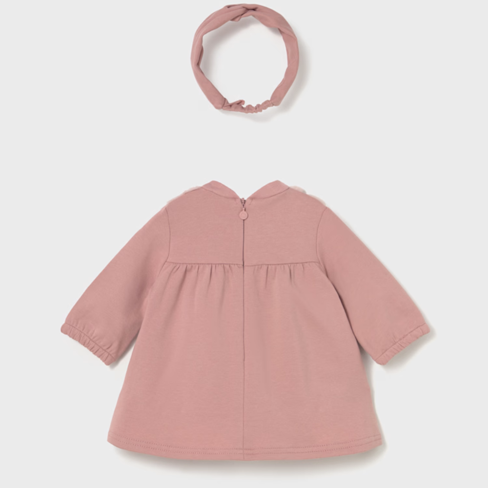 A Mayoral újszülött babaruha szett ruhával és fejpánttal egy finom szett az első kirándulásokhoz, családi összejövetelekhez és emlékképekhez.