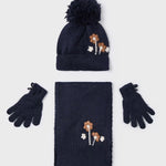 Tengerészkék 3 darabos kesztyű, sapka és sál szett lányoknak 10-es méretben a Mayoral-tól.