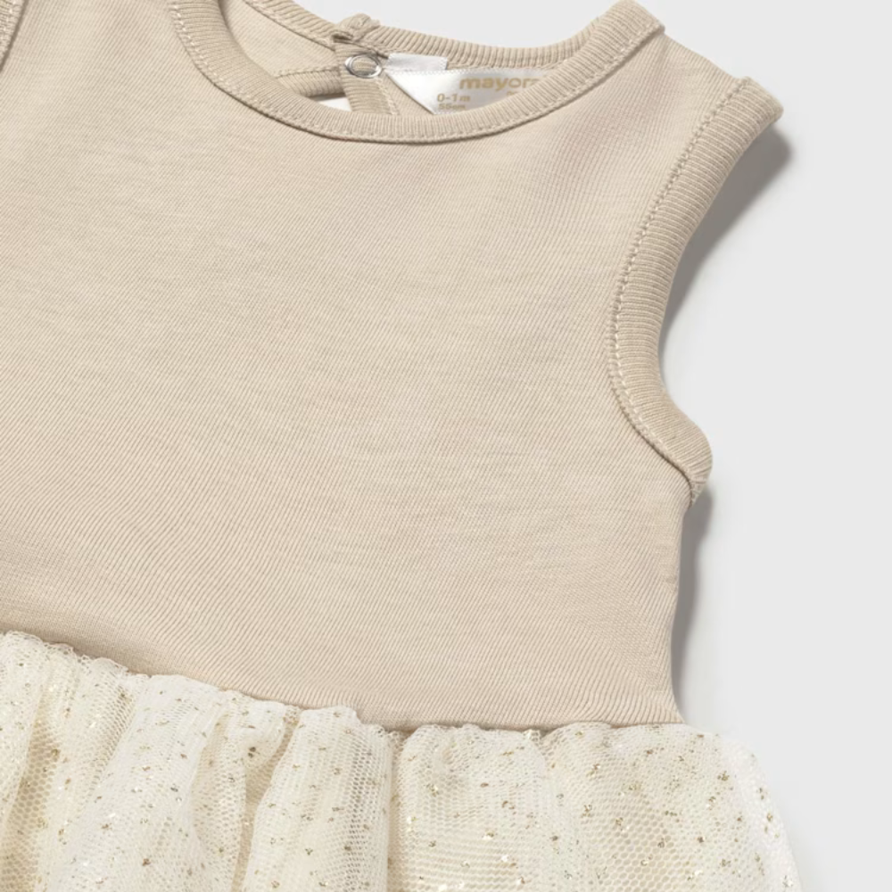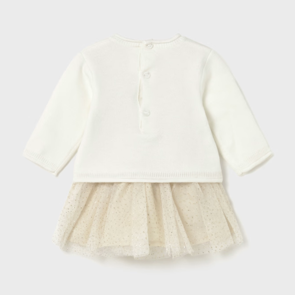 Ez az imádnivaló szett a Mayoraltól egy puha, gombos pulóvert és egy könnyű, tüllel díszített pánt nélküli ruhát kombinál - tökéletes szett családi kirándulásokra és különleges alkalmakra.