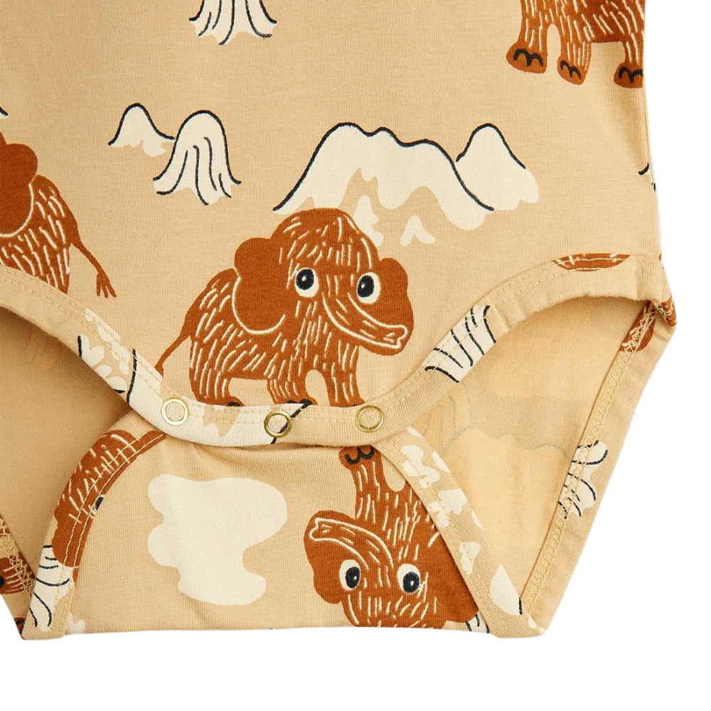 A szett egy hosszú ujjú bodyt és egy leggingset tartalmaz, mindkettőt egy vidám, barátságos mamutokat ábrázoló all-over nyomtatás díszíti egy hegyi táj előtt.