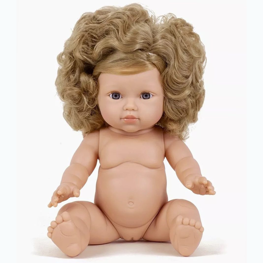 Lola egy klasszikus Minikane baba a Gordis kollekcióból - világos arcbőrrel, hullámos szőke hajjal és szürkéskék szemekkel.