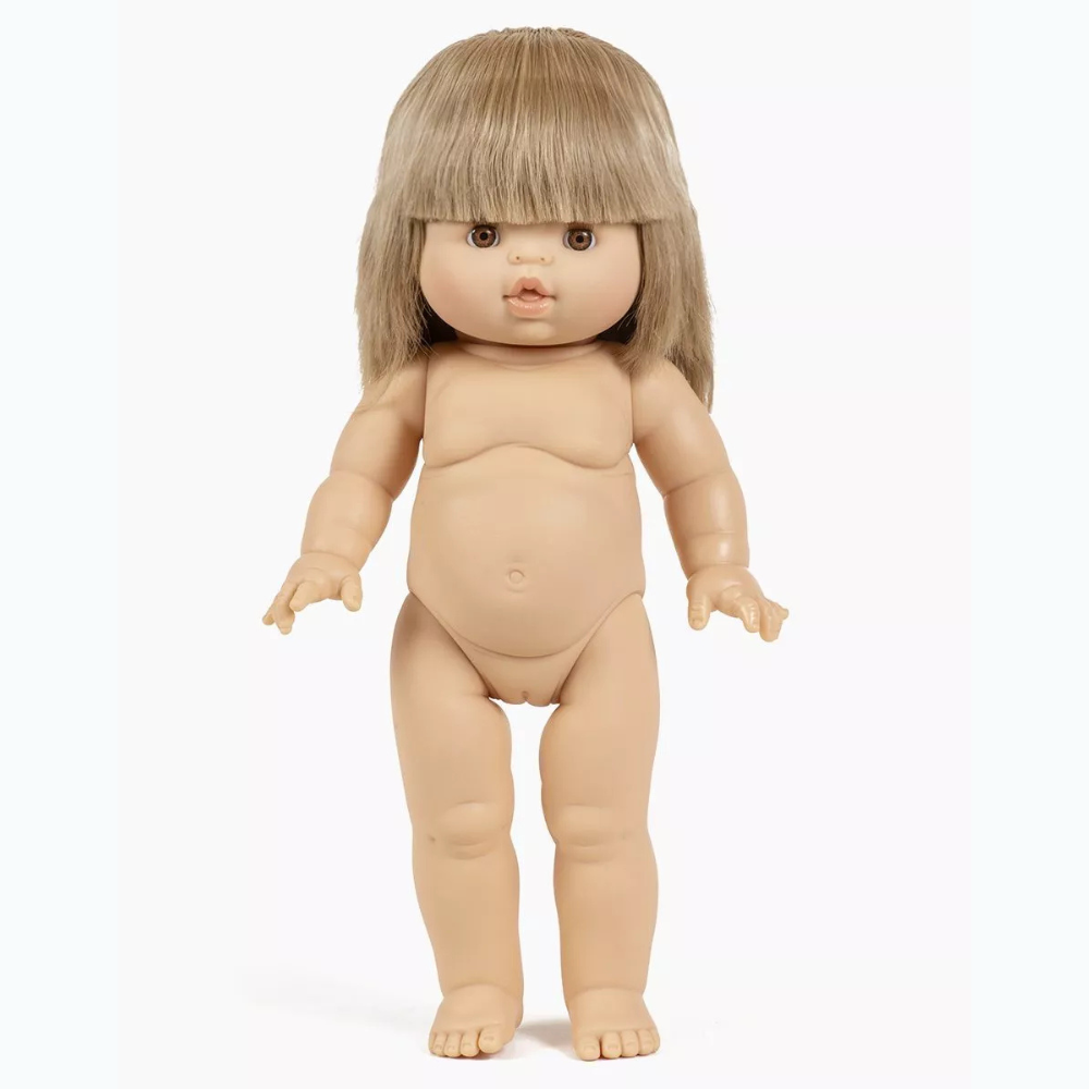 A babának szőke, rojtos haja és barna szeme van, 37 cm-es magassága miatt pedig tökéletesen illik a gyerekek kezébe.